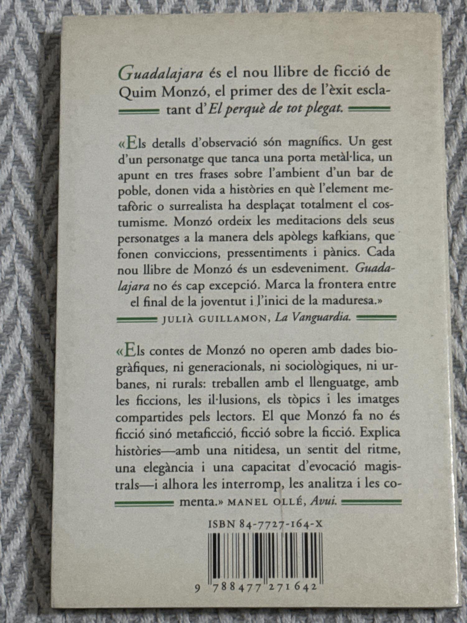 Guadalajara és un recull de narrativa breu on Quim Monzó desplega la seva mirada irònica i lúcida sobre la vida quotidiana. Les històries, aparentment senzilles, se situen en escenaris recognoscibles —una casa, un bar, un carrer— però aviat prenen girs insospitats que barregen el real amb l’absurd i el simbòlic.