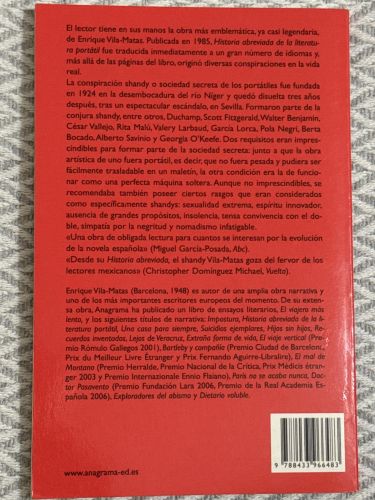 Historia abreviada de la literatura portátil, de Enrique Vila-Matas, plantea una ficción literaria en la que existe una sociedad secreta llamada “la conspiración Shandy”, dedicada a los escritores portátiles, mezclando cultura, humor y la reflexión sobre la propia escritura.