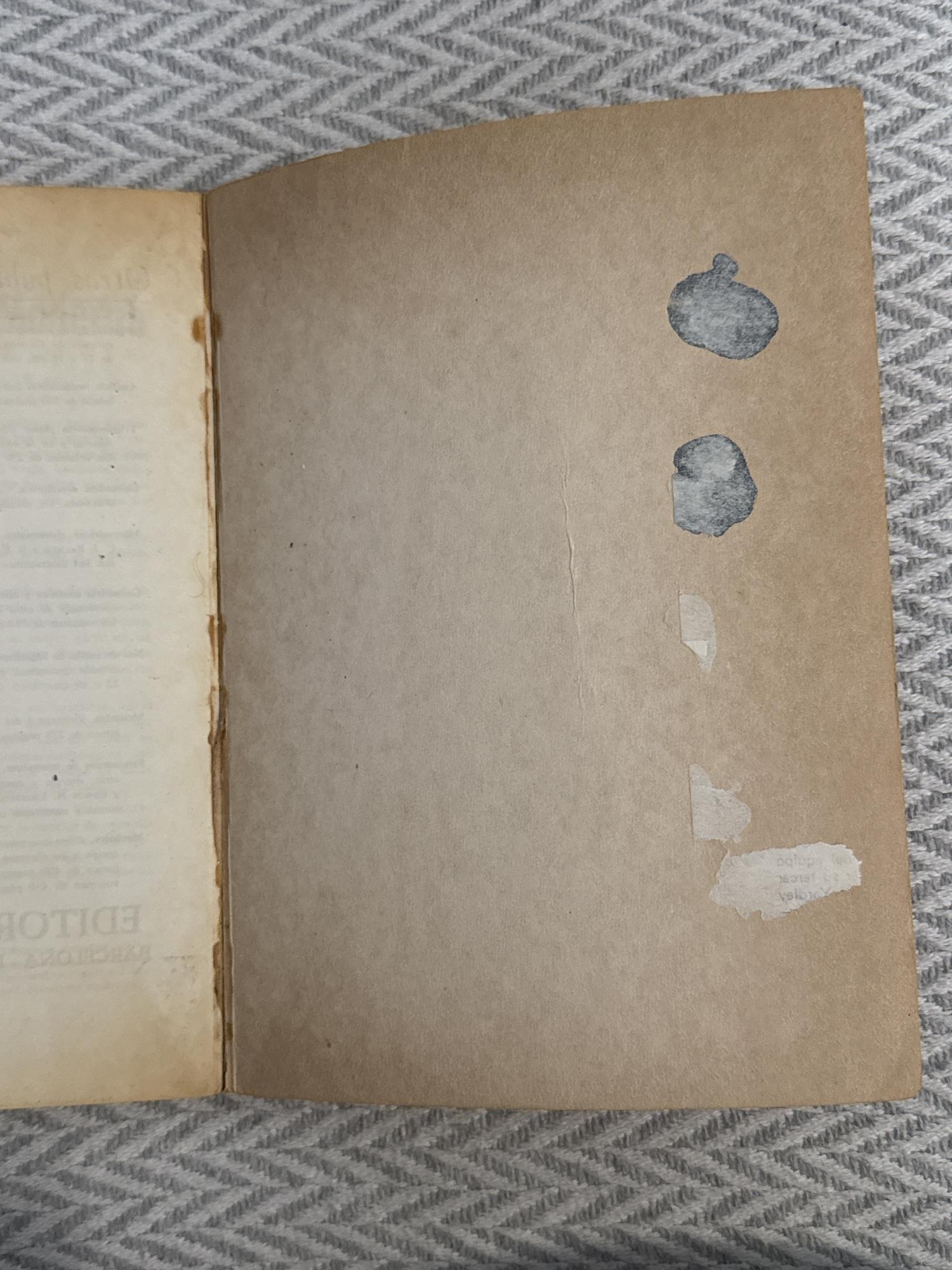 Tapa fatigada. Nombre del propietario anterior escrito en el interior. Con señales de uso en el interior. Ver fotos