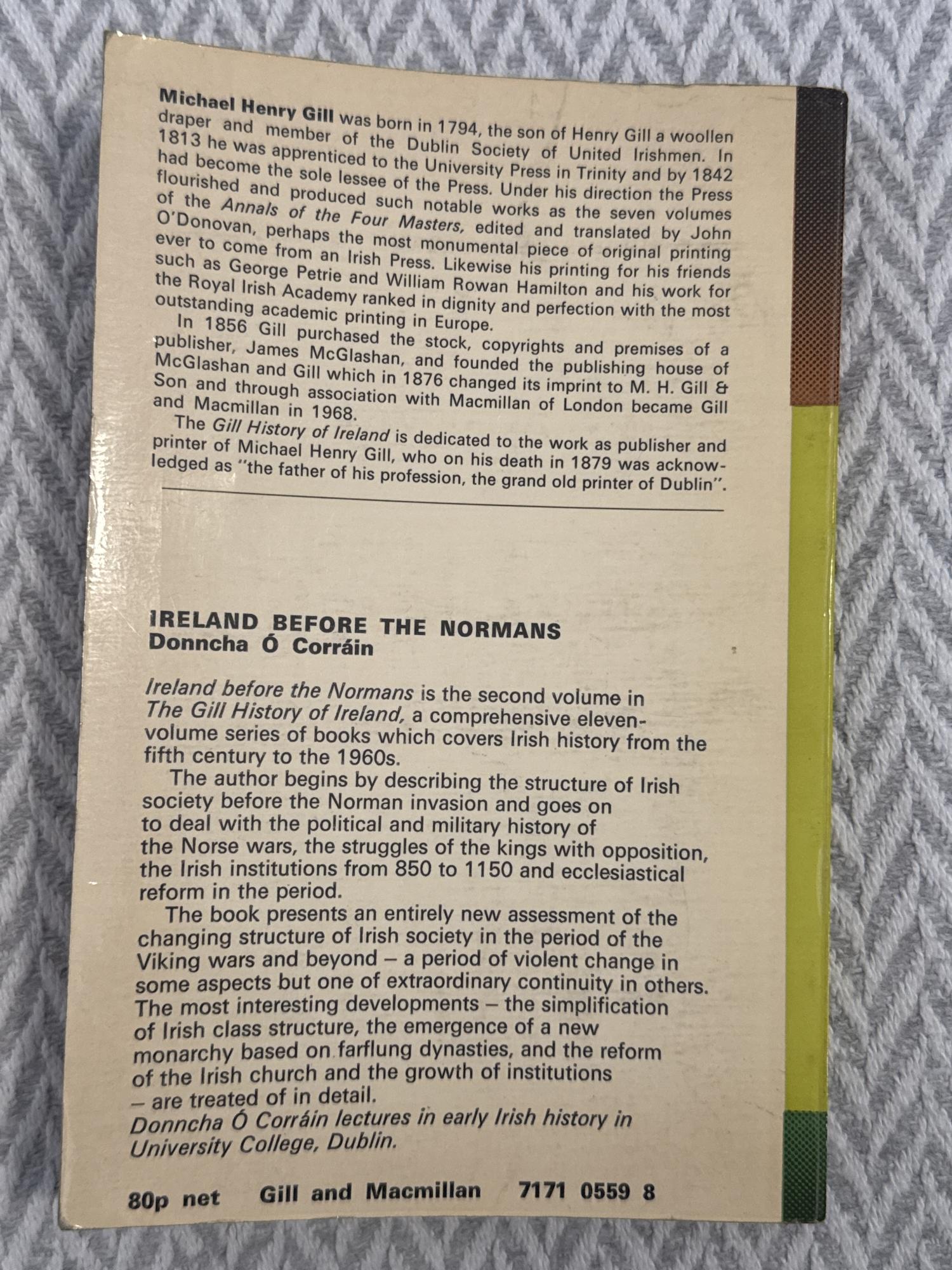 Ireland before the normans, de Donnchadh Ó Corráin, es un estudio sobre la historia de Irlanda antes de la invasión normanda del siglo XII. El libro analiza la organización política, la sociedad, la Iglesia y la cultura irlandesa en la Alta Edad Media, ofreciendo una visión detallada de las estructuras y dinámicas del periodo.