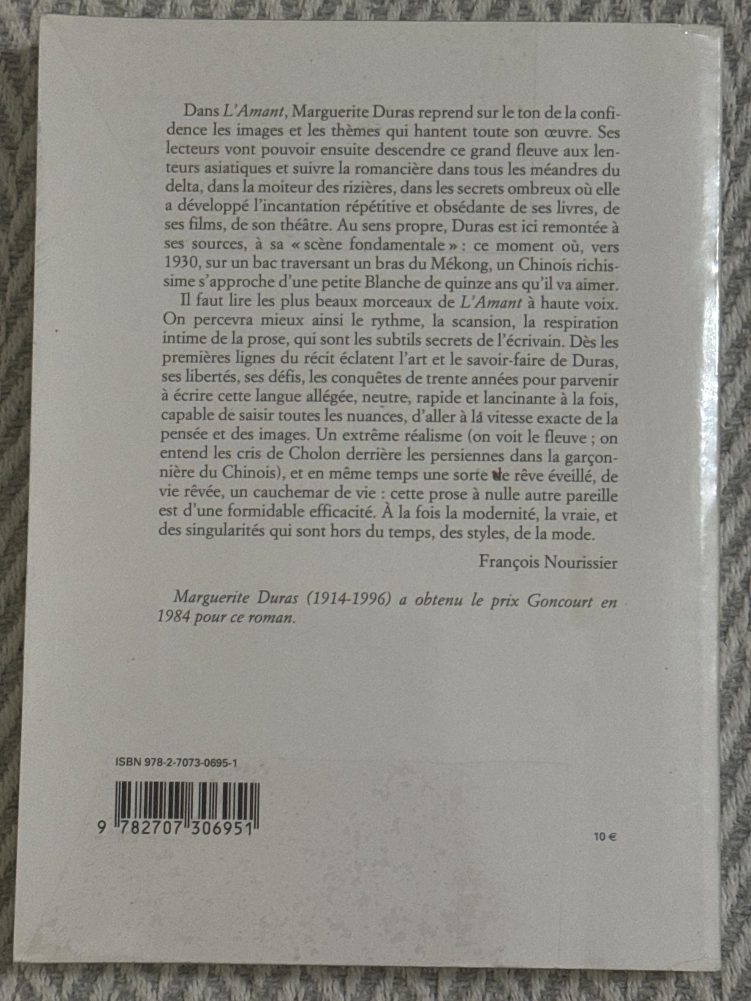 L’Amant narra la relación apasionada y controvertida entre una joven francesa proveniente de Indochina colonial y un hombre chino mucho mayor. Ambientada en Saigón durante los años de la China colonial, la novela explora las tensiones raciales, sociales y afectivas que atraviesan este romance prohibido.