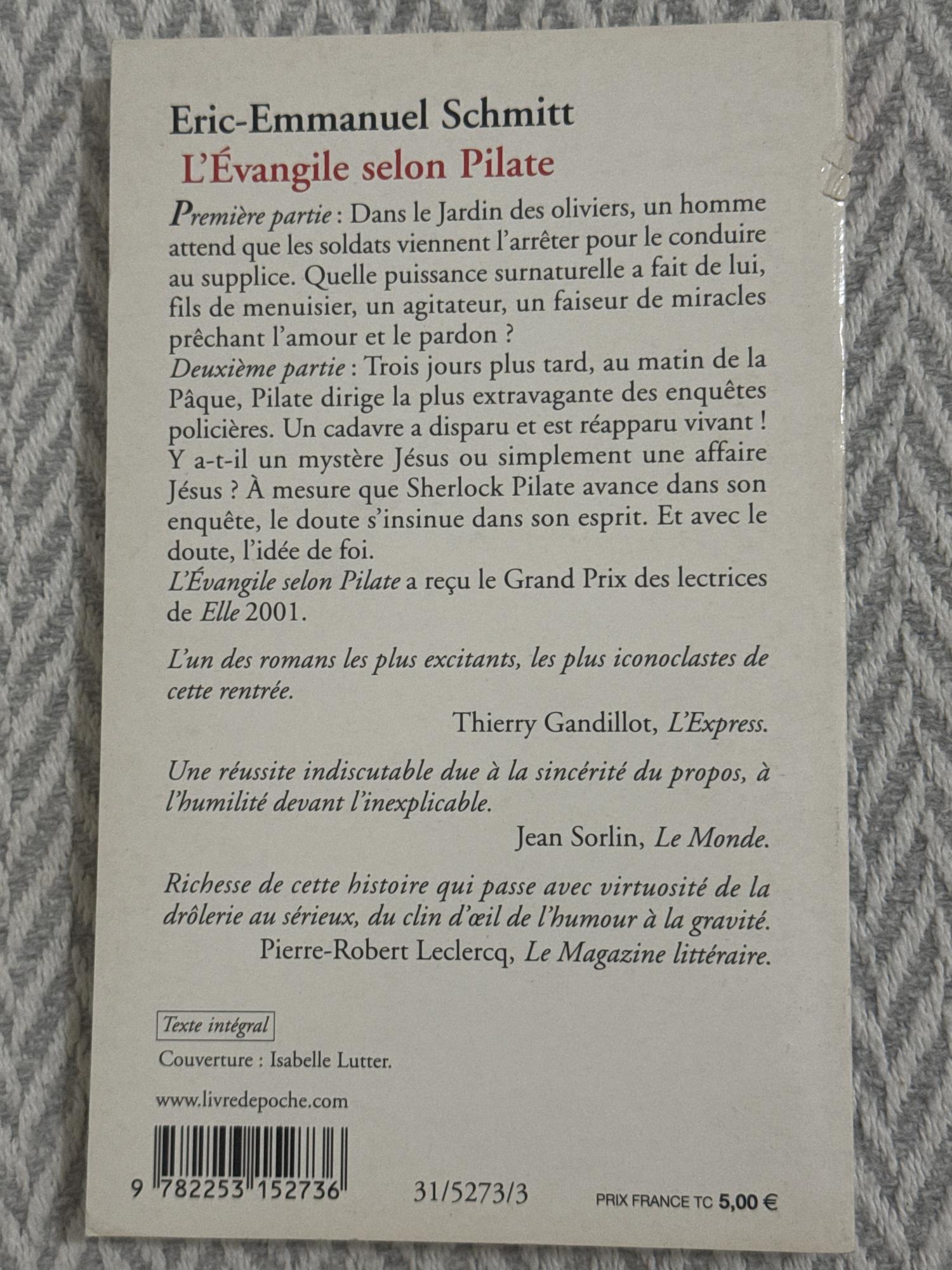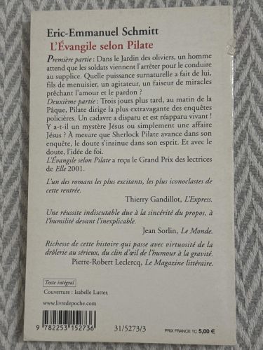 La novela presenta una versión novelada del relato bíblico desde la perspectiva de Poncio Pilato. En L’Évangile selon Pilate, Schmitt explora los conflictos interiores de Pilato después de la desaparición del cuerpo de Cristo y los dilemas morales que lo atormentan como juez, autoridad y hombre.