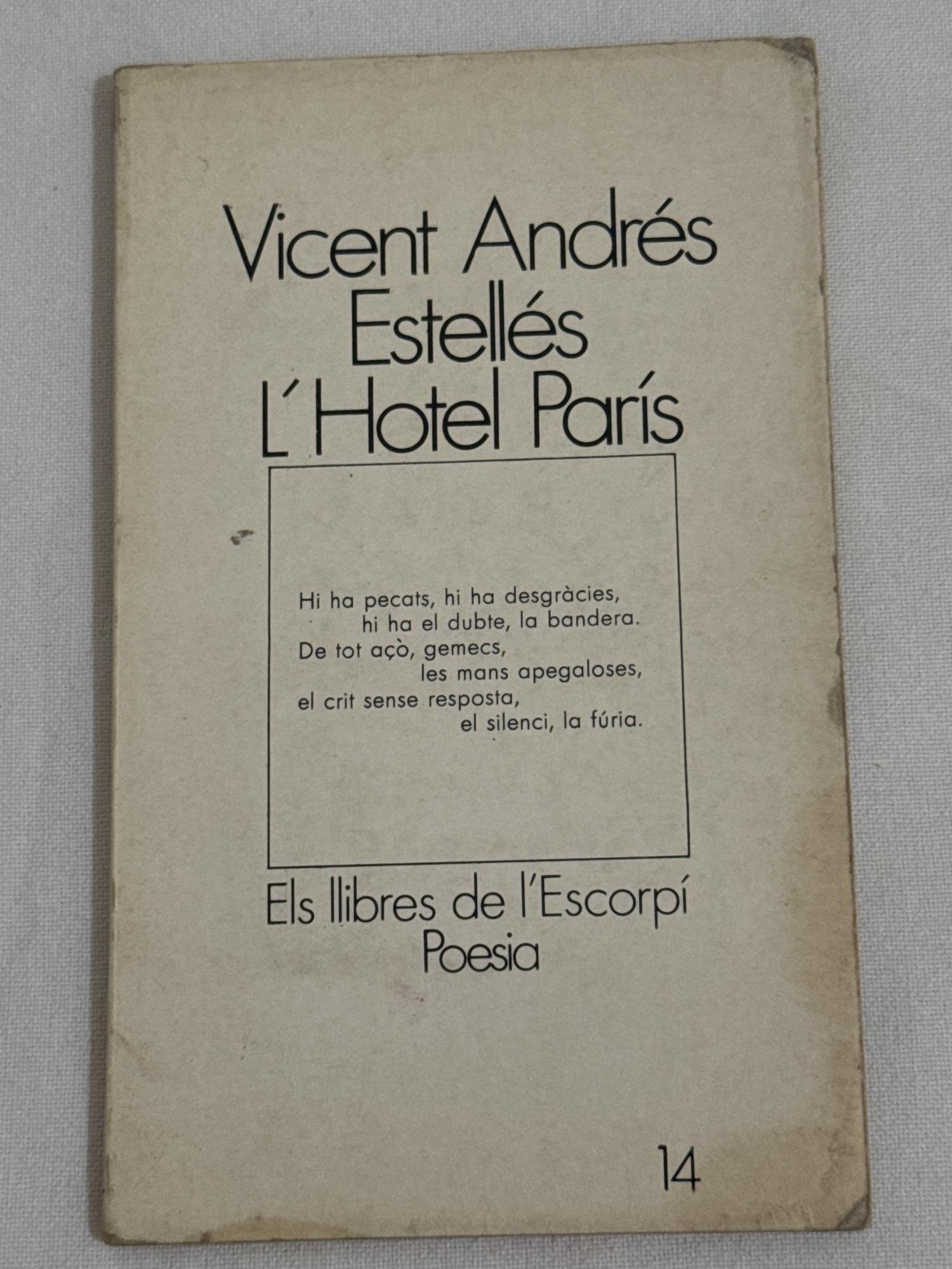 L’hotel París de Vicent Andrés Estellés és un poemari compost el 1956 i publicat el 1973. Constituït per 21 poemes, narra un monòleg interior del poeta adreçat a Françoise, una dona amb qui manté una relació esporàdica en un hotel de la Rambla de Barcelona. A través d’aquest diàleg íntim, Estellés explora temes com l’amor, la solitud, la mort, la repressió i la identitat en el context de la postguerra espanyola. El poemari destaca per la seva intensitat emocional i la seva capacitat per capturar l’essència de l’experiència humana en una època de profunda tensió social i política.