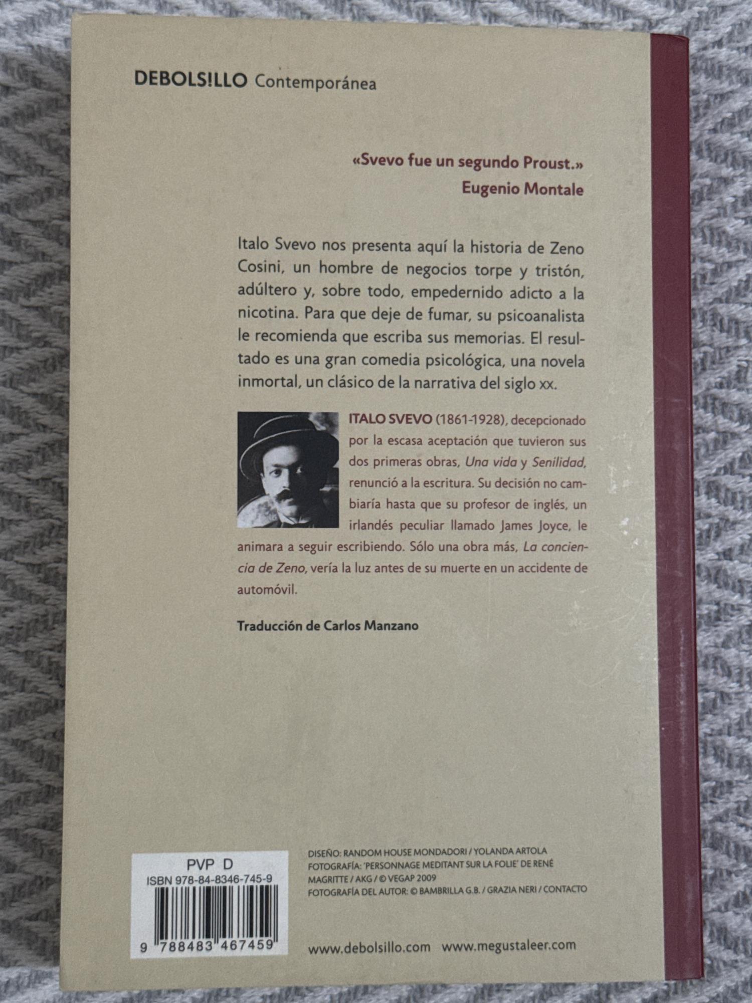 En La conciencia de Zeno, Italo Svevo narra la vida de Zeno Cosini, un hombre atormentado por sus vicios (como el tabaquismo) y sus contradicciones internas. Para combatir su adicción al tabaco, acude a un psicoanalista que le sugiere escribir sus memorias, lo que convierte la novela en una exploración profunda y casi humorística de la conciencia humana.