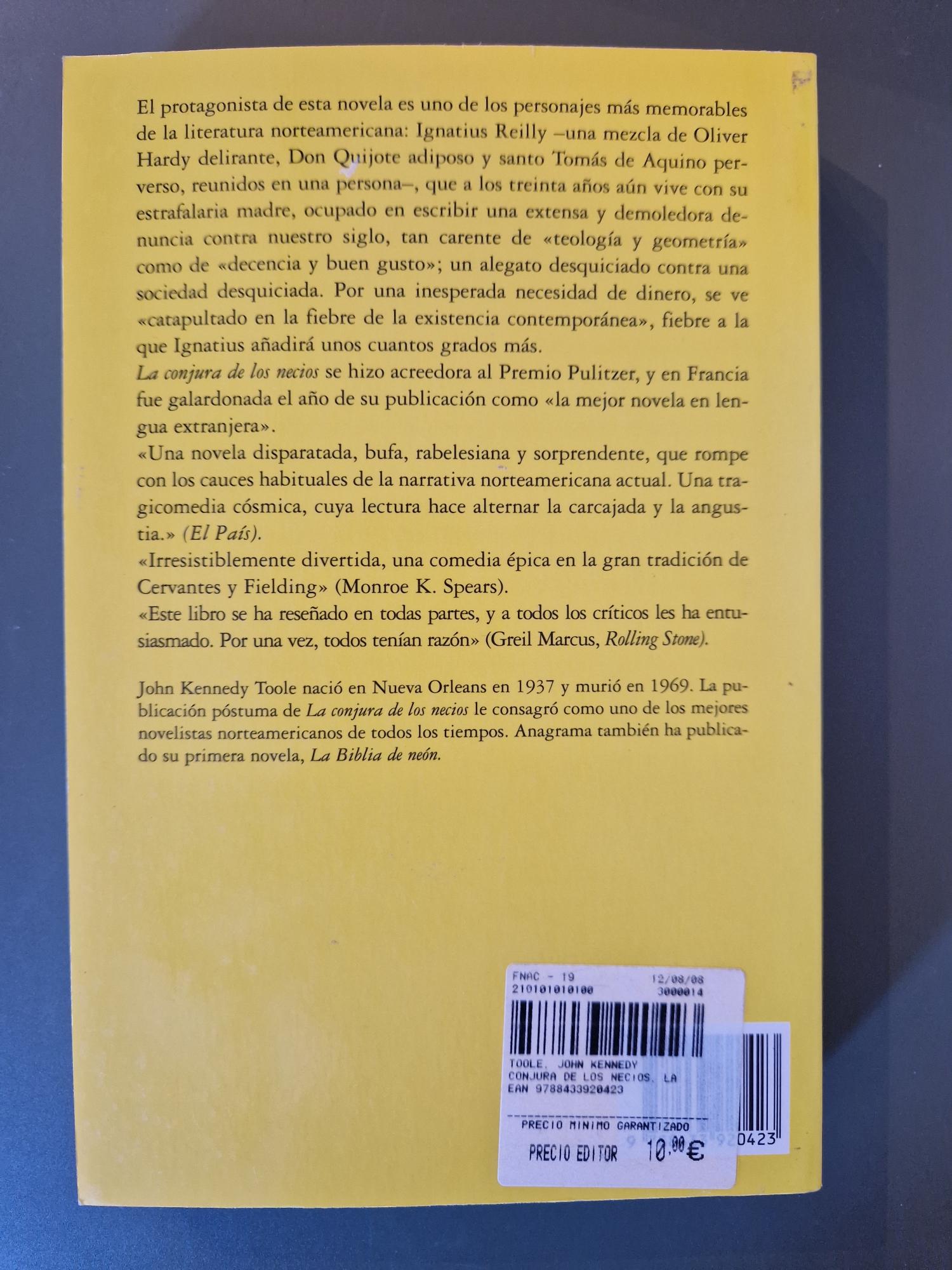 La conjura de los necios, de John Kennedy Toole, es una sátira desbordante protagonizada por Ignatius J. Reilly, un personaje tan excéntrico como inolvidable que deambula por Nueva Orleans enfrentado a un mundo que no entiende —ni que lo entiende a él—. Con humor mordaz y situaciones delirantes, la novela retrata las contradicciones sociales y la genialidad absurda de su antihéroe. Una obra magistral y divertidísima que se ha convertido en un clásico contemporáneo.
