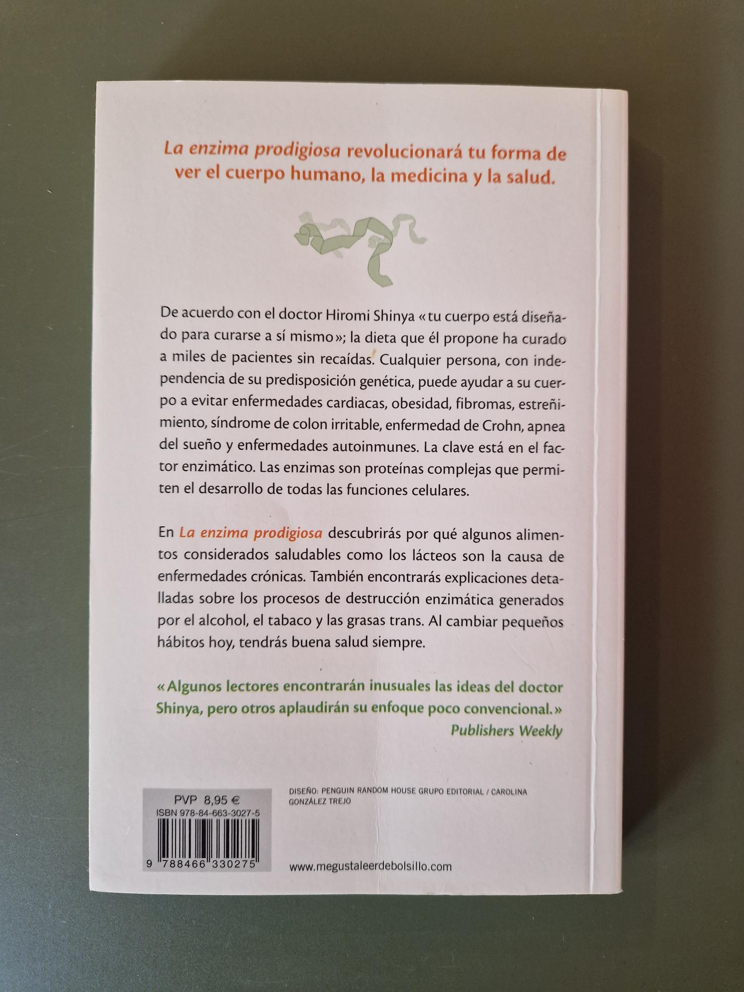 El doctor Hiromi Shinya, reconocido especialista en salud digestiva, plantea en este libro una visión revolucionaria sobre el papel de las enzimas en el bienestar y la longevidad. A partir de su experiencia clínica, propone hábitos alimentarios y de vida destinados a proteger la “enzima madre”, clave —según su teoría— para prevenir enfermedades. Con un enfoque divulgativo y práctico, invita a replantear nuestra relación con la comida y el cuerpo. Una obra que ha despertado gran interés en el ámbito de la salud natural y la nutrición preventiva.