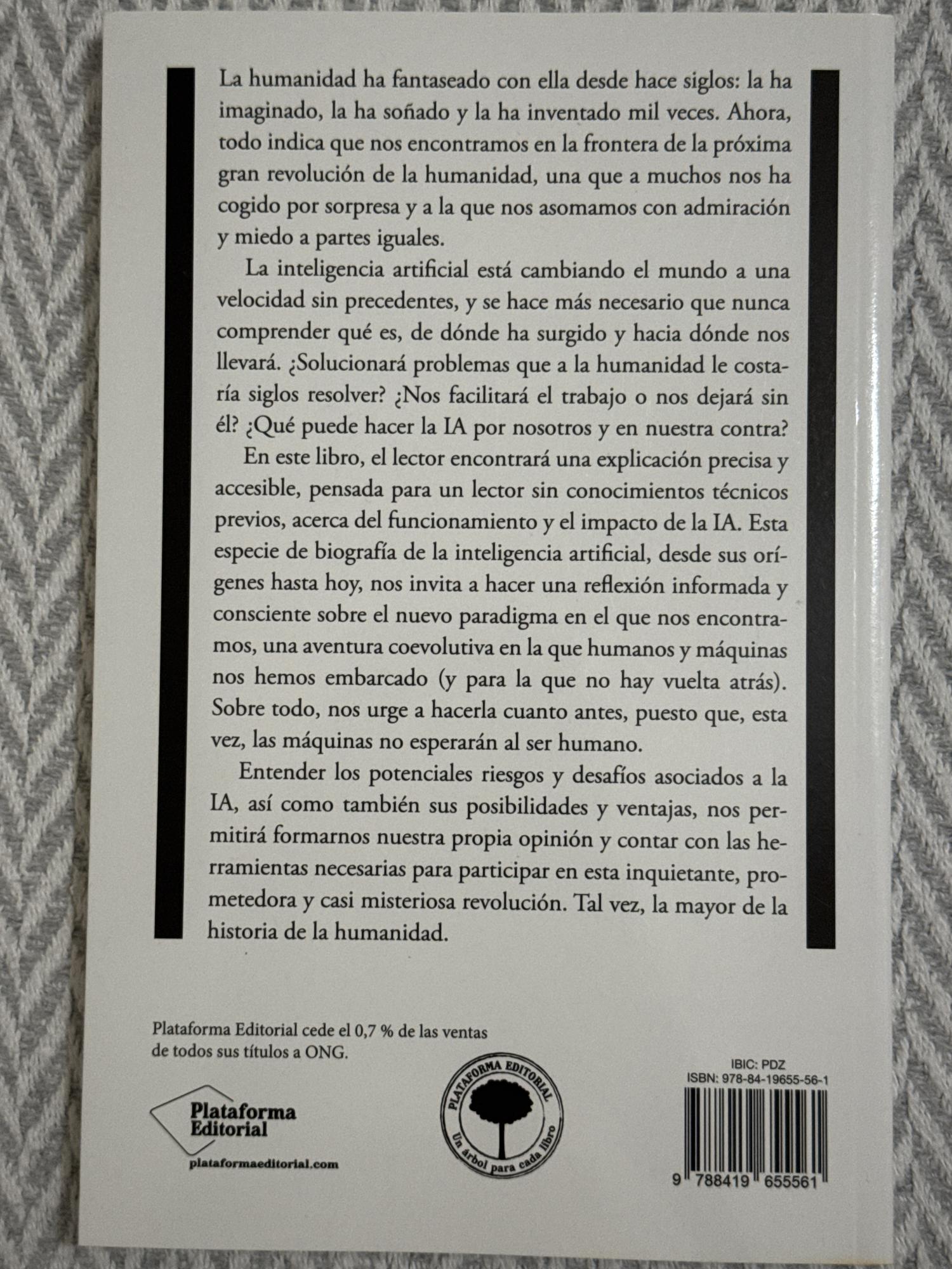 La inteligencia artificial explicada a los humanos es una obra divulgativa que introduce al lector en los fundamentos y posibilidades de la IA mediante un lenguaje cercano y accesible. Explica cómo funciona esta tecnología, sus aplicaciones cotidianas y los dilemas éticos o sociales que podría generar en el futuro.