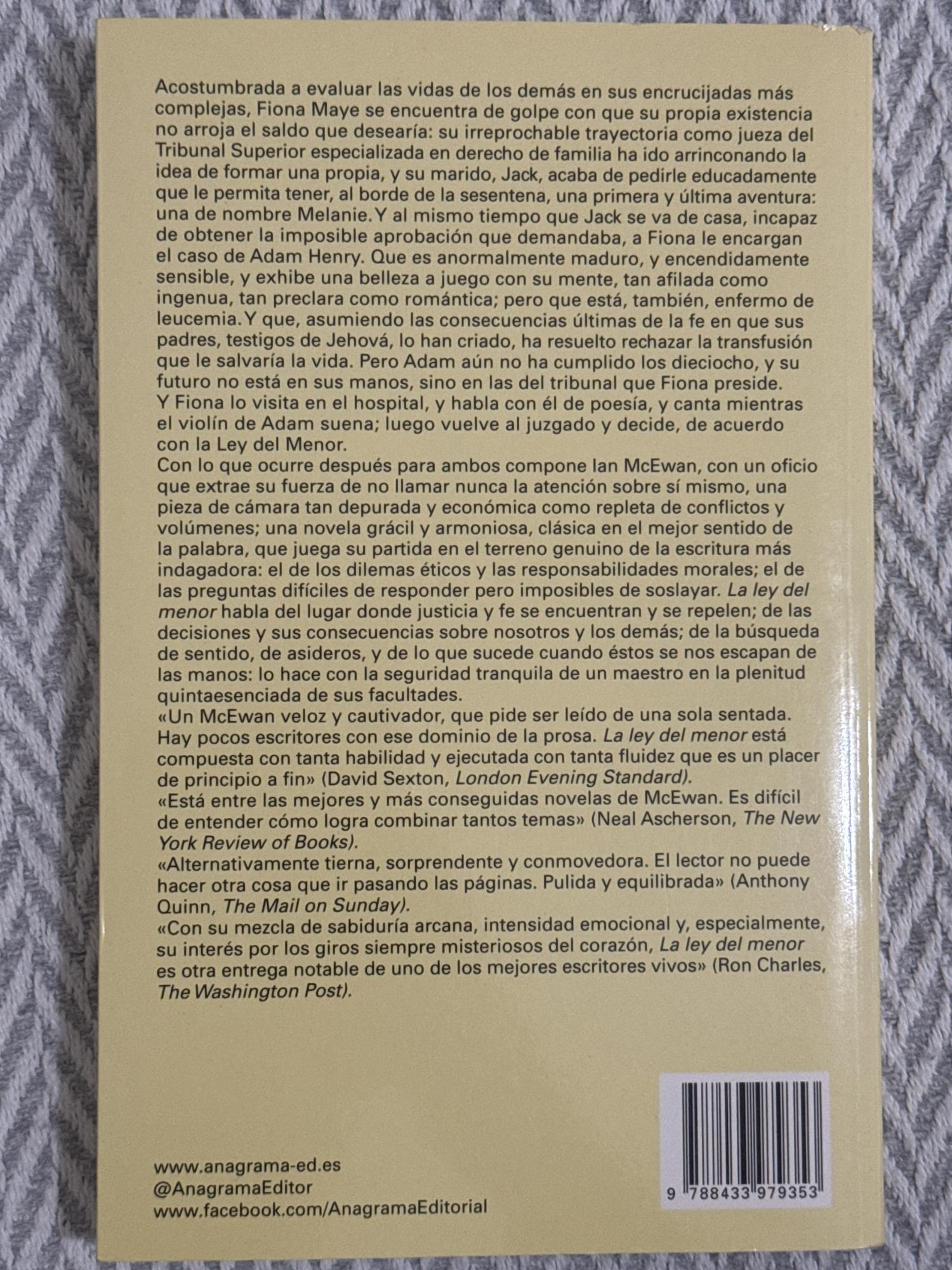La ley del menor de Ian McEwan presenta a Fiona Maye, jueza del Tribunal Superior especializada en derecho de familia, que debe decidir sobre un caso dramático: un joven con leucemia rechaza recibir transfusiones por motivos religiosos. A la par, ella lidia con su propia vida personal fracturada, lo que la enfrenta a profundas tensiones morales y emocionales.