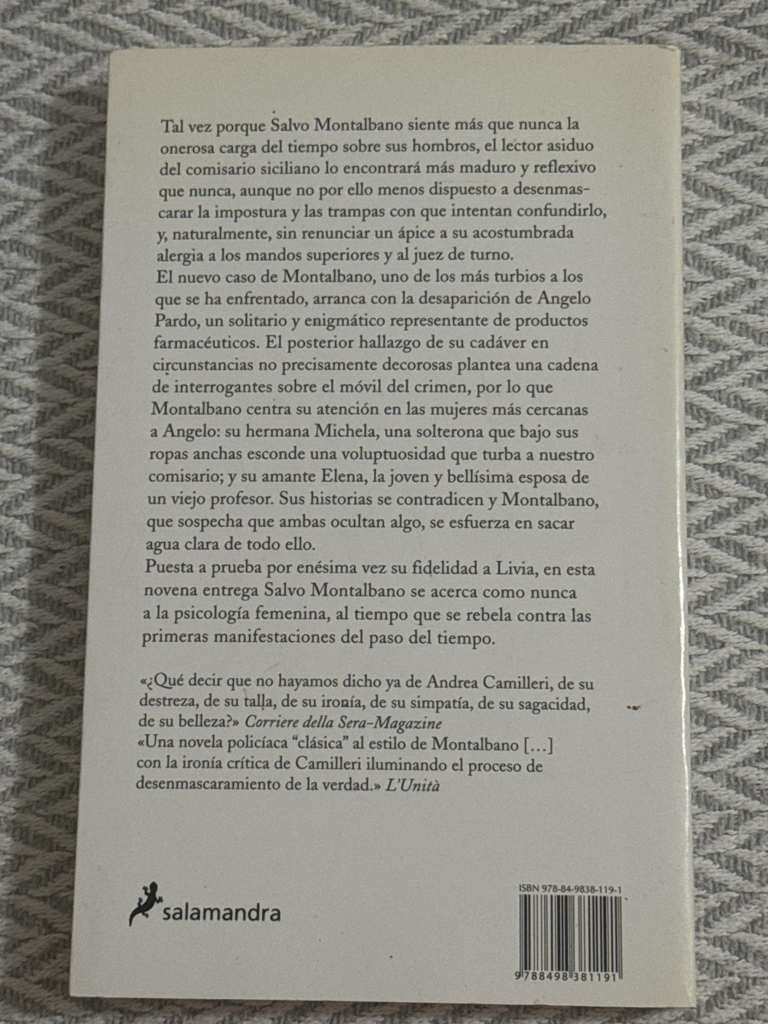El caso comienza con la misteriosa desaparición de Angelo Pardo, un representante farmacéutico solitario. Su cadáver es hallado en circunstancias escandalosas, lo que desencadena una investigación centrada en las mujeres más cercanas a él: su hermana Michela, y su amante Elena. Ambas ocultan secretos, y Montalbano, con su singular sagacidad, desentraña sus verdades ocultas. La historia lo lleva a explorar íntimamente la psicología femenina y a confrontar las primeras señales del paso del tiempo.