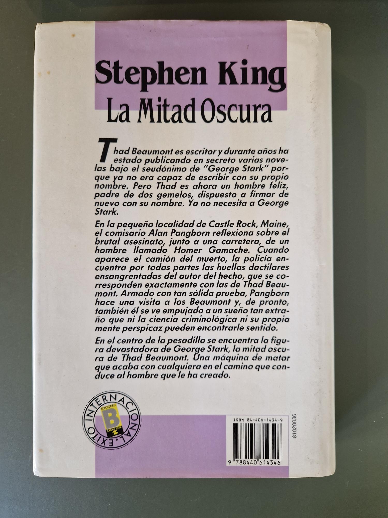 La mitad oscura, de Stephen King, es un inquietante thriller psicológico donde un escritor debe enfrentarse al doble siniestro que él mismo creó. Lo que empezó como un simple seudónimo cobra vida propia y se convierte en una presencia violenta, decidida a tomar el control. Con una tensión que no deja respiro, King explora los límites de la identidad y la oscuridad que todos podemos llevar dentro.