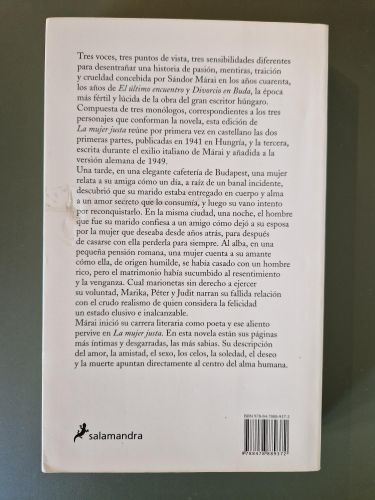 La mujer justa, de Sándor Márai, es un brillante retrato de un triángulo amoroso narrado desde tres voces que revelan verdades contradictorias sobre el deseo, la decepción y la fragilidad humana. Cada testimonio ilumina las pasiones y mentiras que modelan una relación, mostrando cómo el amor puede ser tan revelador como destructivo. Una novela intensa y elegante que explora con lucidez las complejidades del alma y el abismo que separa lo que sentimos de lo que mostramos.