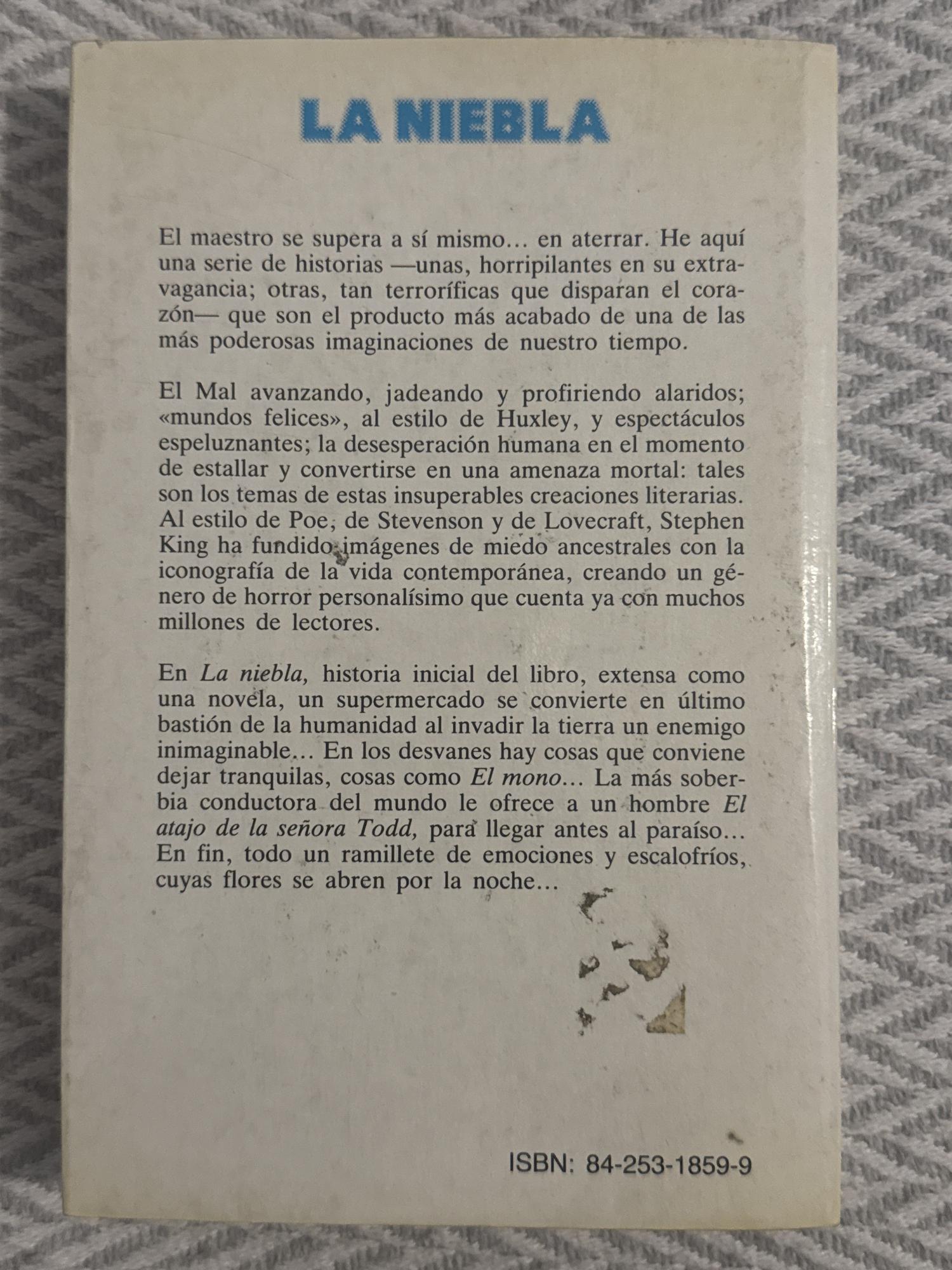 La historia sigue a un grupo de personas atrapadas en un supermercado mientras una misteriosa niebla envuelve el exterior y oculta criaturas peligrosas. A medida que crece la tensión, surgen conflictos humanos tan inquietantes como la amenaza exterior. Es un relato de Stephen King que combina terror y reflexión sobre el comportamiento humano.