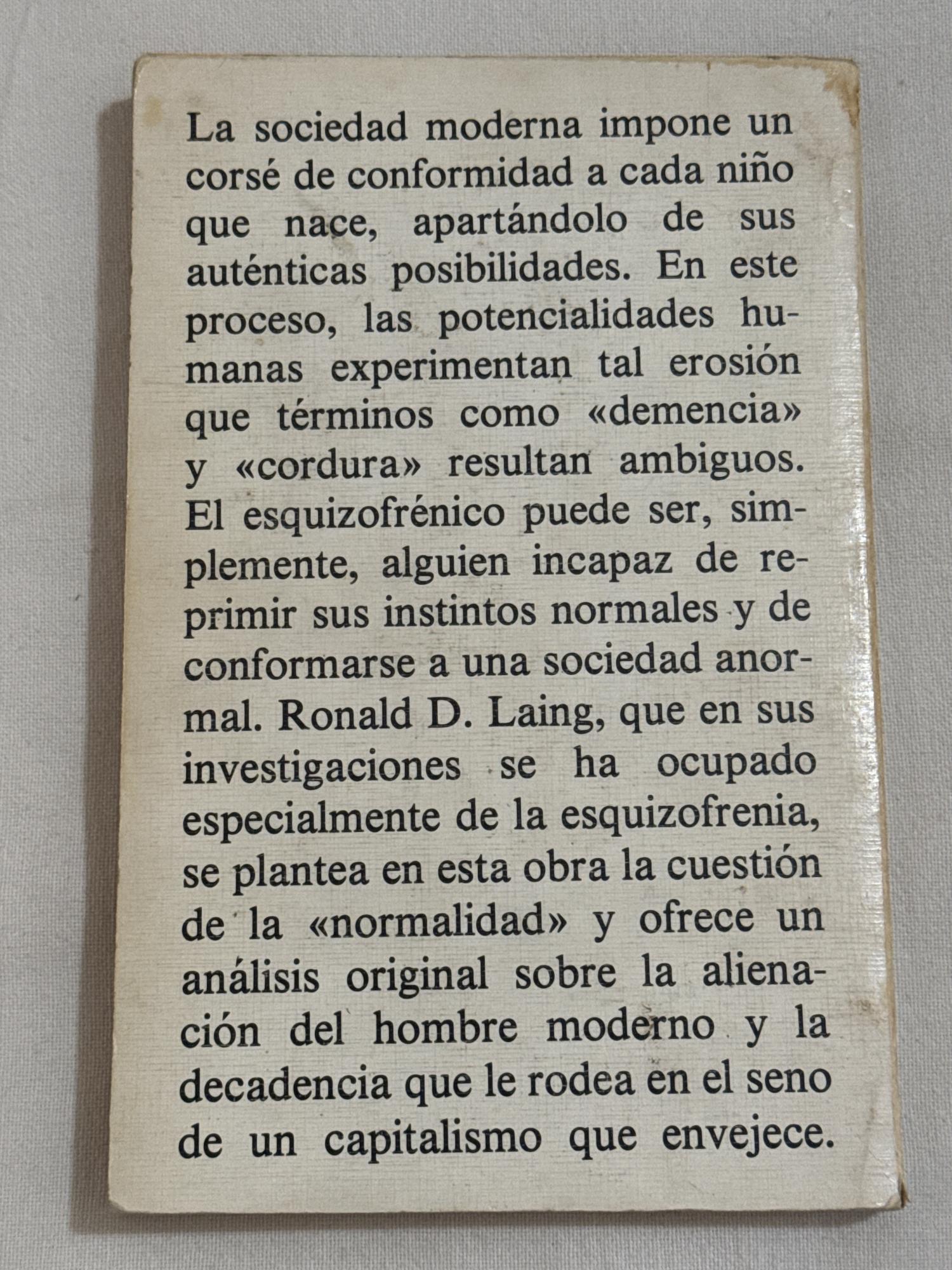 La obra plantea una crítica profunda a la sociedad moderna, argumentando que condiciona desde la infancia la conformidad y reduce las potencialidades humanas. Según Laing, conceptos como “demencia” o “cordura” son ambiguos, ya que lo que se considera esquizofrenia muchas veces no es más que la imposibilidad de reprimir los instintos naturales para adaptarse a una sociedad alienante. Además, analiza cómo el capitalismo envejecido favorece la alienación y erosiona la autenticidad del ser humano.