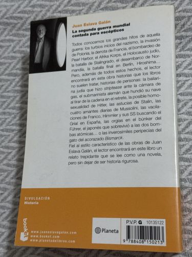 La Segunda Guerra Mundial contada para escépticos (Juan Eslava Galán) es un libro de divulgación histórica que narra la Segunda Guerra Mundial con rigor, pero en un tono ameno, ágil y lleno de anécdotas curiosas, acercando los grandes hechos del conflicto y las historias menos conocidas a todo tipo de lectores.