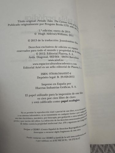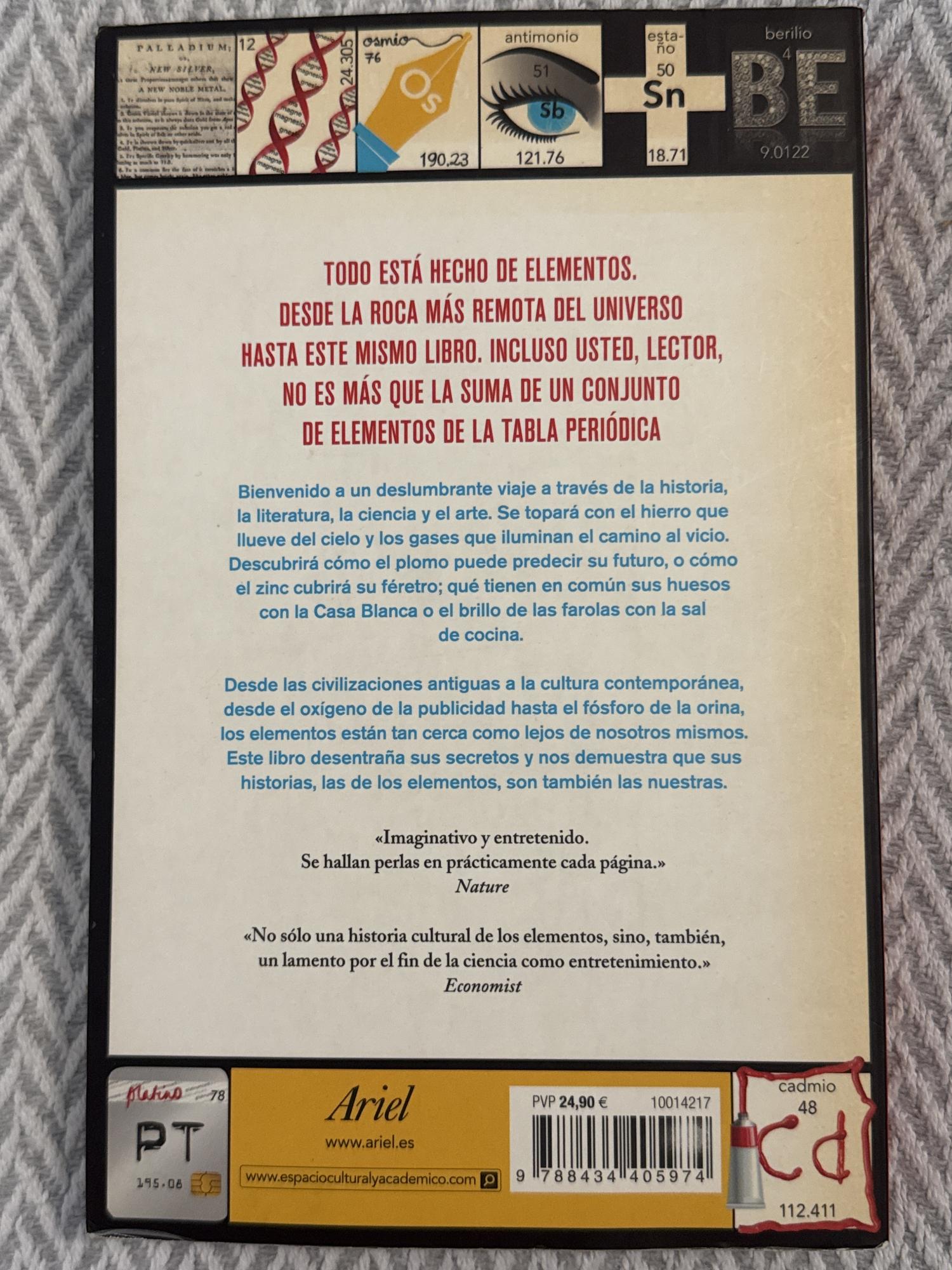 El libro recorre la historia y las curiosidades de los elementos químicos organizados en la tabla periódica, combinando ciencia, cultura e historia. A través de anécdotas y ejemplos, muestra cómo los elementos han influido en la sociedad, la tecnología y el arte. Es una obra divulgativa que acerca la química de forma amena y accesible.