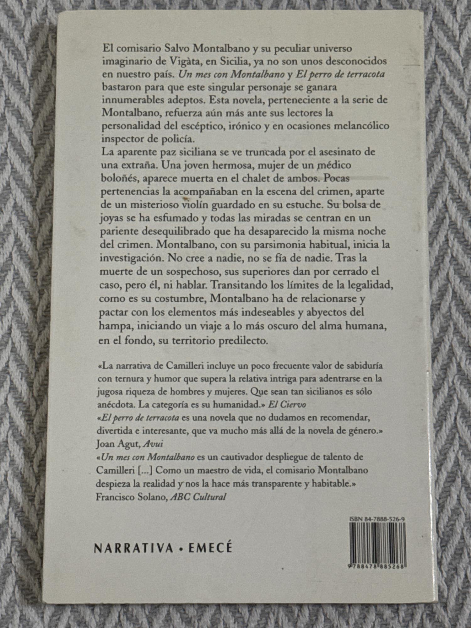 En La voz del violín, se desarrolla en el imaginario pueblo siciliano de Vigàta, donde reina una calma aparente que se rompe con el hallazgo del muerto de una joven hermosa, esposa de un médico boloñés. Aparece asfixiada en su chalet, sin joyas tras robadas y con un violín misterioso en su estuche, que se convierte en una pista clave.