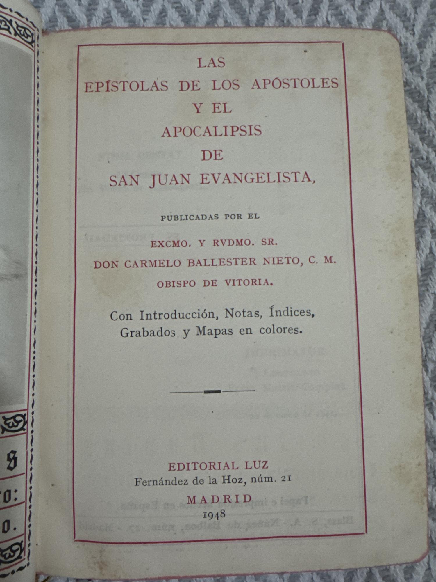 El volumen reúne las epístolas apostólicas del Nuevo Testamento junto con el Apocalipsis, texto profético y simbólico atribuido a San Juan, que aborda la esperanza escatológica y la victoria final del bien. Incluye escritos doctrinales y pastorales dirigidos a las primeras comunidades cristianas, así como una visión apocalíptica de fuerte contenido teológico y simbólico.