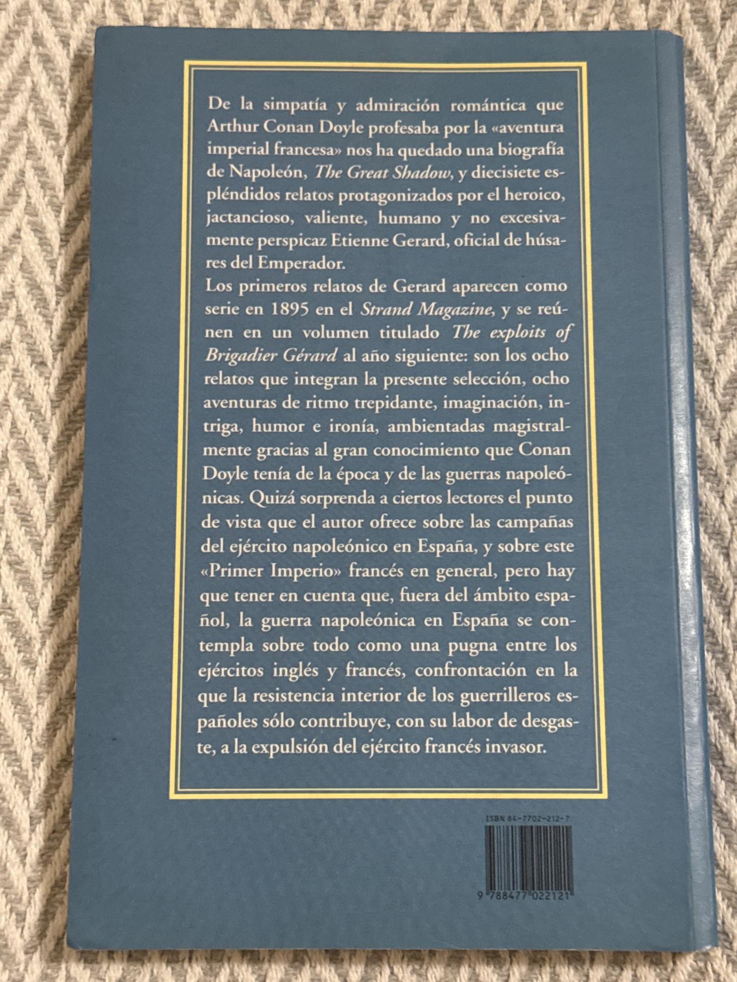 Las hazañas del brigadier Gerard reúne ocho relatos protagonizados por el vivaz y vanidoso Brigadier Étienne Gerard, oficial de húsares durante las Guerras Napoleónicas. Doyle, con su habitual maestría narrativa y sentido del humor, retrata con ironía y espíritu aventurero las peripecias de Gerard, un personaje valiente y poco perspicaz, cuya perspectiva ofrece una visión inusual del conflicto entre ejércitos franceses e ingleses. Ambientado con precisión histórica, el volumen destaca la capacidad de Doyle para combinar acción, intriga y pasión por el mundo militar napoleónico.