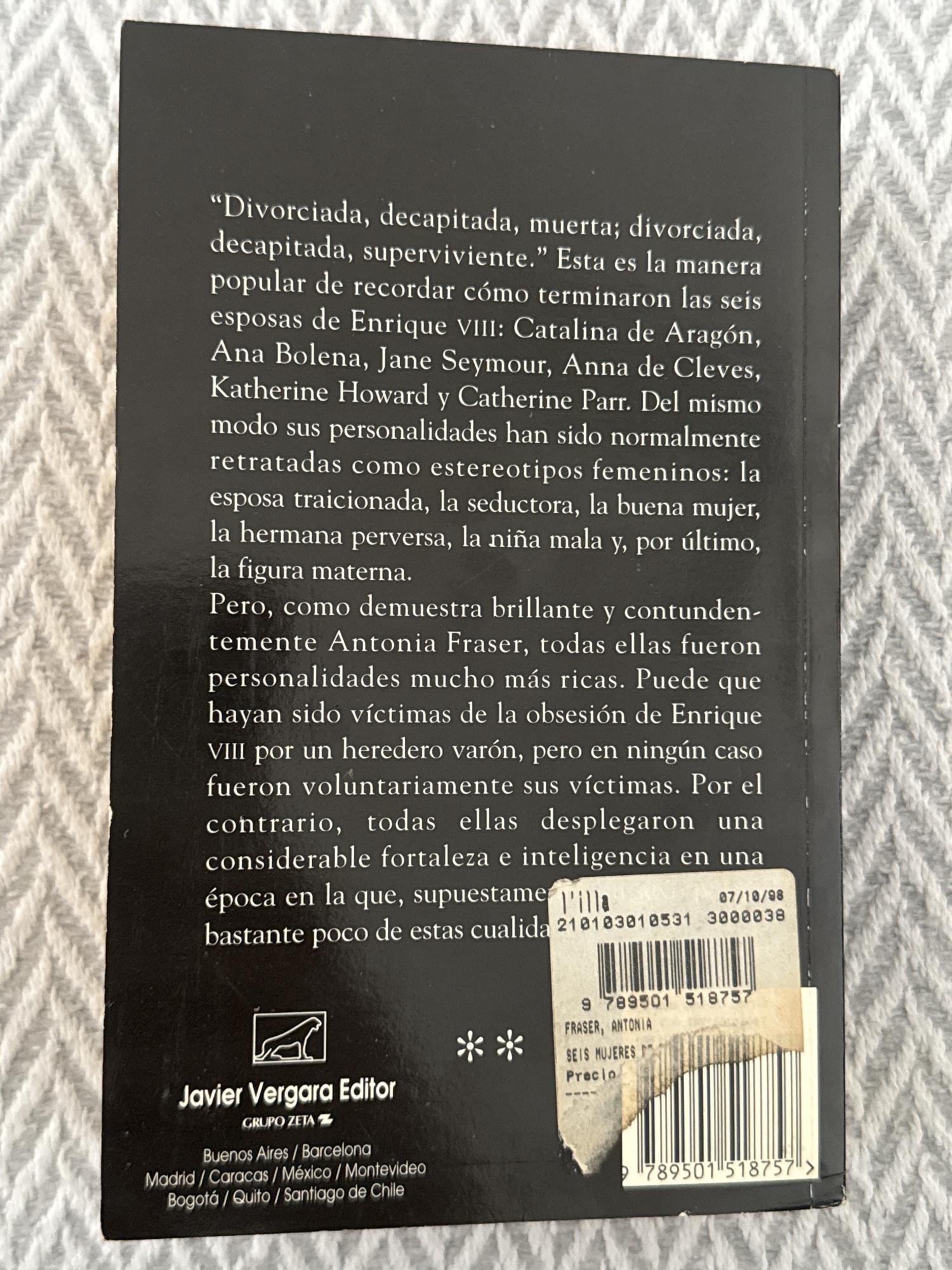 Las seis mujeres de Enrique VIII, de Antonia Fraser, es un estudio histórico que analiza la vida de las esposas de Henry VIII of England desde una perspectiva biográfica. La obra reconstruye sus historias personales, su papel en la corte Tudor y las circunstancias políticas y sociales que marcaron sus destinos.