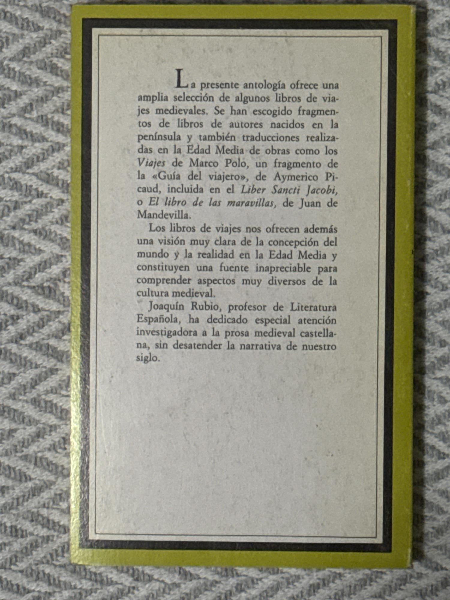 Libros españoles de viajes medievales, edición literaria de Joaquín Rubio Tovar, es una obra académica que recopila y estudia textos españoles de viajes de la Edad Media. El volumen analiza estos relatos desde una perspectiva histórica y filológica, atendiendo a su contexto cultural, sus fuentes y su valor como testimonio de la mentalidad medieval y de la literatura de viajes.