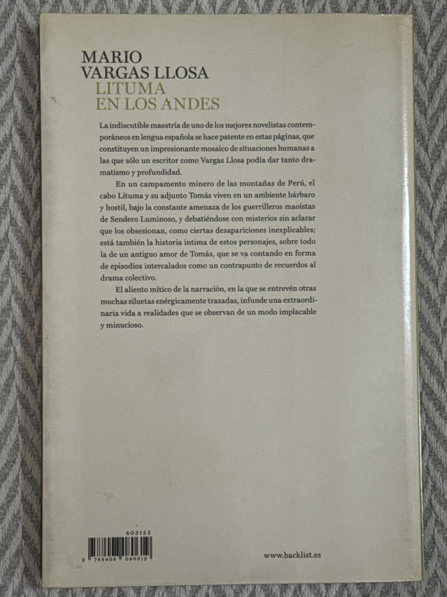 Lituma en los Andes de Mario Vargas Llosa cuenta la historia del cabo Lituma y su ayudante Tomás, quienes en un remoto campamento minero andino investigan tres desapariciones en medio del terrorismo de Sendero Luminoso. La novela combina el drama social con una intriga sobre la culpa, la memoria y las tensiones entre cultura rural y modernidad.