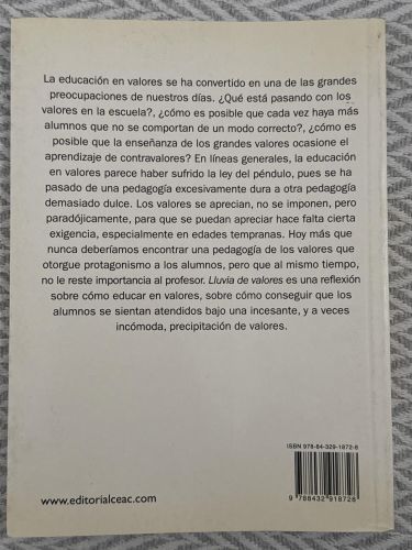 Lluvia de valores reflexiona sobre la importancia de la educación en valores en la escuela y en la sociedad, planteando preguntas sobre qué está fallando en la transmisión de principios éticos a jóvenes. Ofrece una visión crítica de los cambios sociales y propone la urgencia de recuperar una educación basada en valores humanos fundamentales. Es un libro dirigido a docentes, educadores o cualquier persona interesada en el papel de la moral y la ética en la formación personal y colectiva.