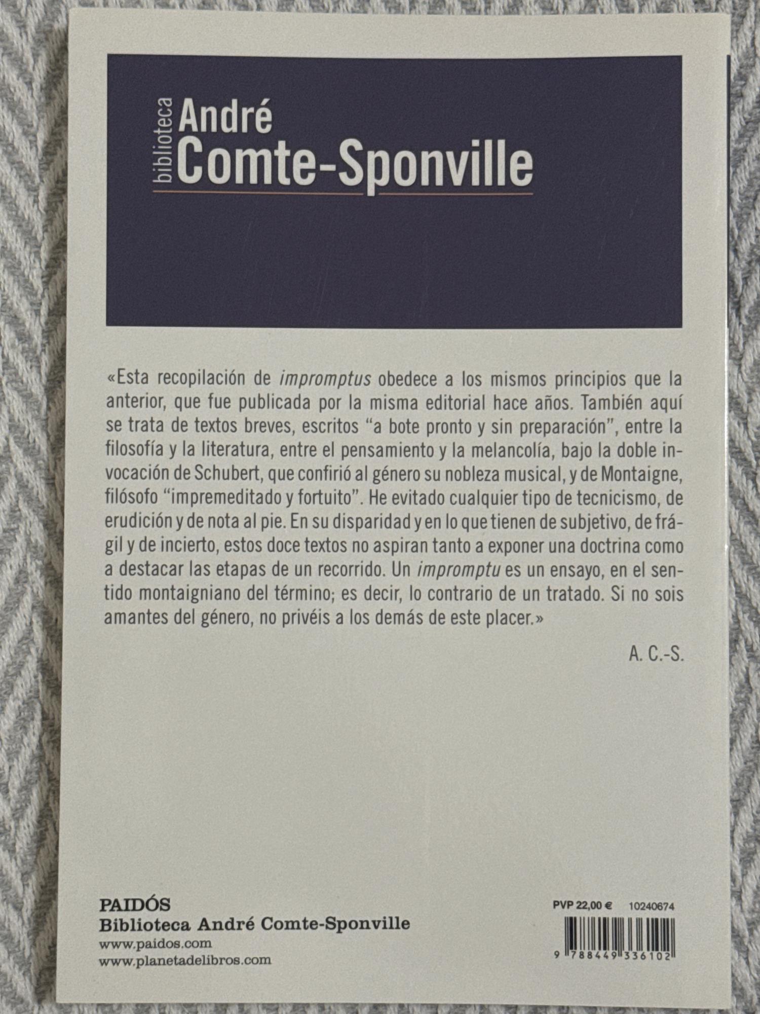 En Lo inconsolable y otros impromptus, André Comte-Sponville ofrece doce textos breves donde reflexiona con estilo personal sobre temas esenciales como la moral, la felicidad, el arte y la política. No pretende construir una doctrina sólida, sino inducir al lector a pensar junto con él.