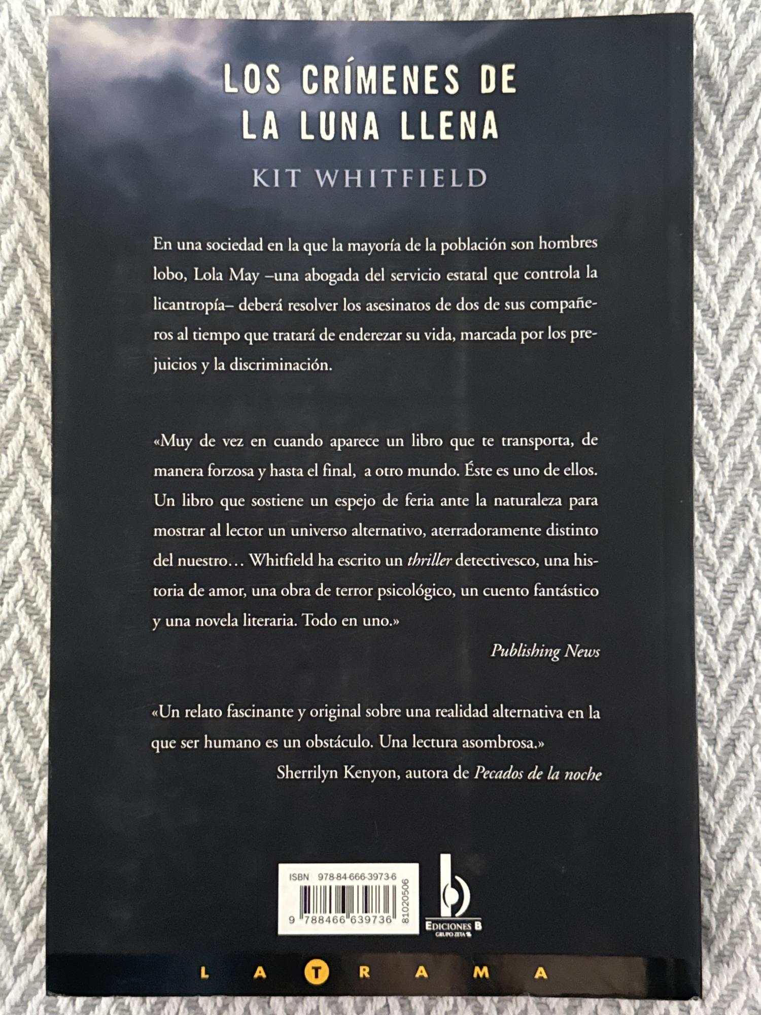 Los crímenes de la luna llena es una novela de intriga criminal en un universo donde la mayoría de la población son hombres lobo; la protagonista, Lola May, es abogada encargada de controlar la licantropía y debe investigar una serie de asesinatos mientras enfrenta prejuicios sociales. La historia combina elementos de thriller policial con fantasía y suspense en un mundo original y distópico.