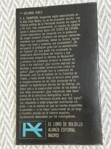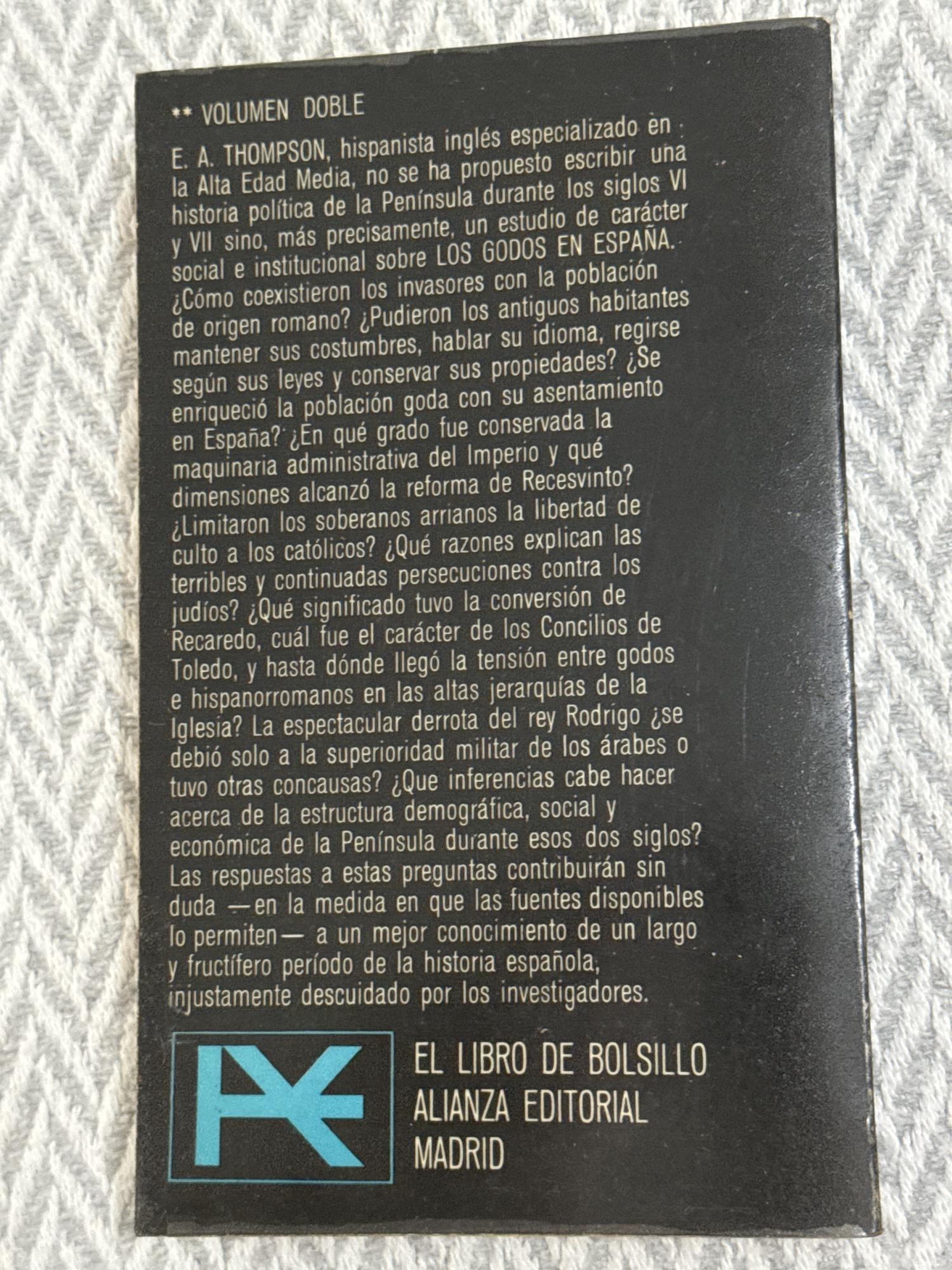 Los godos en España estudia la llegada, asentamiento y organización del reino visigodo en la península ibérica, analizando sus estructuras políticas, sociales y religiosas tras la caída del Imperio romano. Thompson explica cómo se produjo la integración entre población hispanorromana y élites godas y cuál fue el papel del Estado visigodo en la historia peninsular.