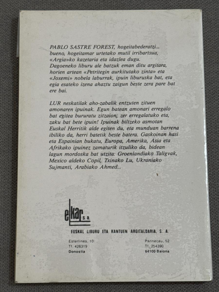 Euskal Liburu eta Kantuen Argitaldaria, 1988, Vasco / Euskara, 19 x 13cm, 108pp. Tapa blanda ilustrada. Interior ilustrado en B/N. Con señales normales de uso. En buen estado.