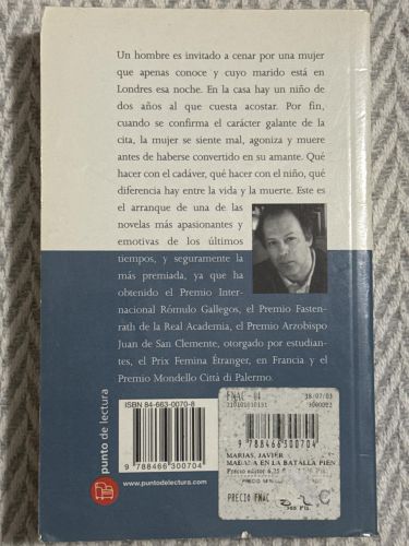 Un hombre vive una situación límite cuando la mujer con la que iba a tener una relación muere repentinamente junto a él. A partir de ese momento, la culpa, el secreto y la incertidumbre transforman su vida mientras intenta relacionarse con los allegados de ella. Marías utiliza una voz introspectiva y envolvente para explorar la fragilidad humana, la fatalidad y los límites entre verdad y silencio.