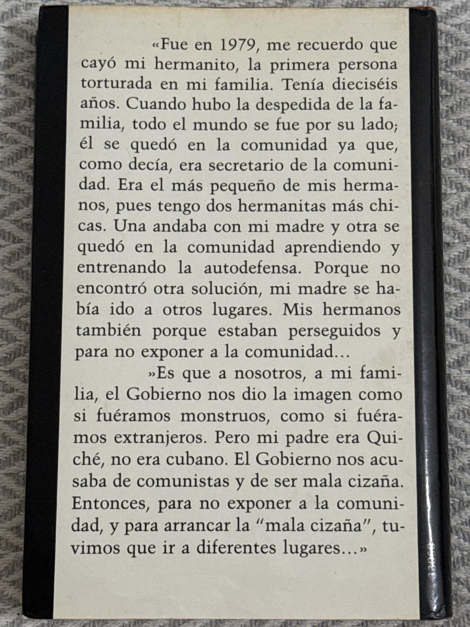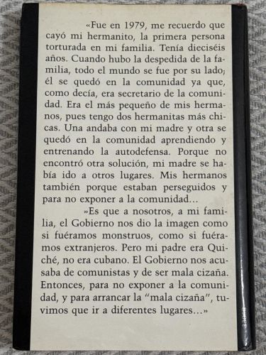 En este libro Rigoberta relata su vida: sus orígenes, su infancia, las tradiciones de su pueblo, el sufrimiento de los indígenas guatemaltecos, las injusticias sociales y la represión que vivieron durante las dictaduras militares.