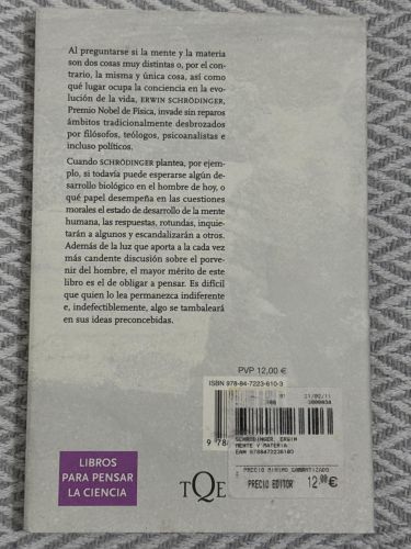 Una colección de conferencias impartidas en 1956 donde Schrödinger reflexiona sobre la relación entre mente y materia —es decir, sobre la conciencia, la vida y su fundamento físico— proponiendo puntos de vista que intersecan física, biología y filosofía. Sus ideas han despertado debates profundos sobre la naturaleza de la mente y la vida misma.