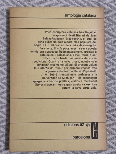Mots-propis i altres proses, de Joan Salvat-Papasseit, és un recull de textos en prosa que reflecteixen el pensament i la sensibilitat de l’autor. L’obra combina reflexions personals, impressions i idees sobre la vida, l’art i la societat, amb un estil directe i expressiu.