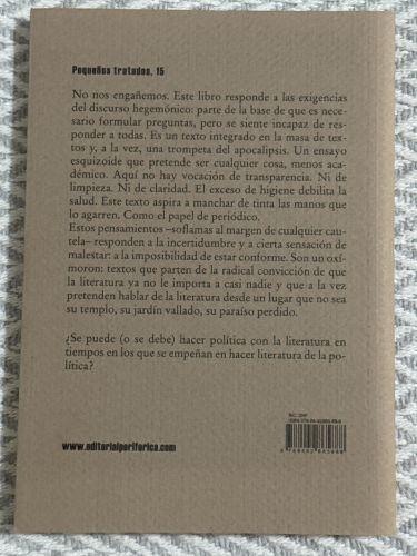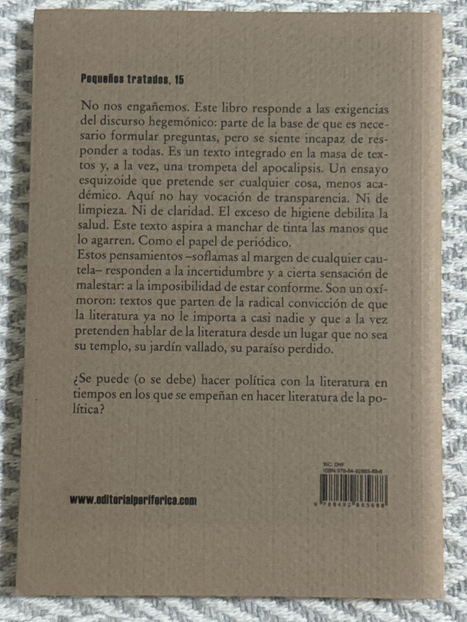 Este libro es un ensayo provocador que rechaza la pretensión de responder con total claridad, y en lugar de eso lanza preguntas y juicios que buscan incomodar. Con un estilo crudo e impreciso a propósito, Sanz expresa malestar frente al discurso hegemónico y reflexiona sobre la literatura, lo político y la insatisfacción ante el presente.