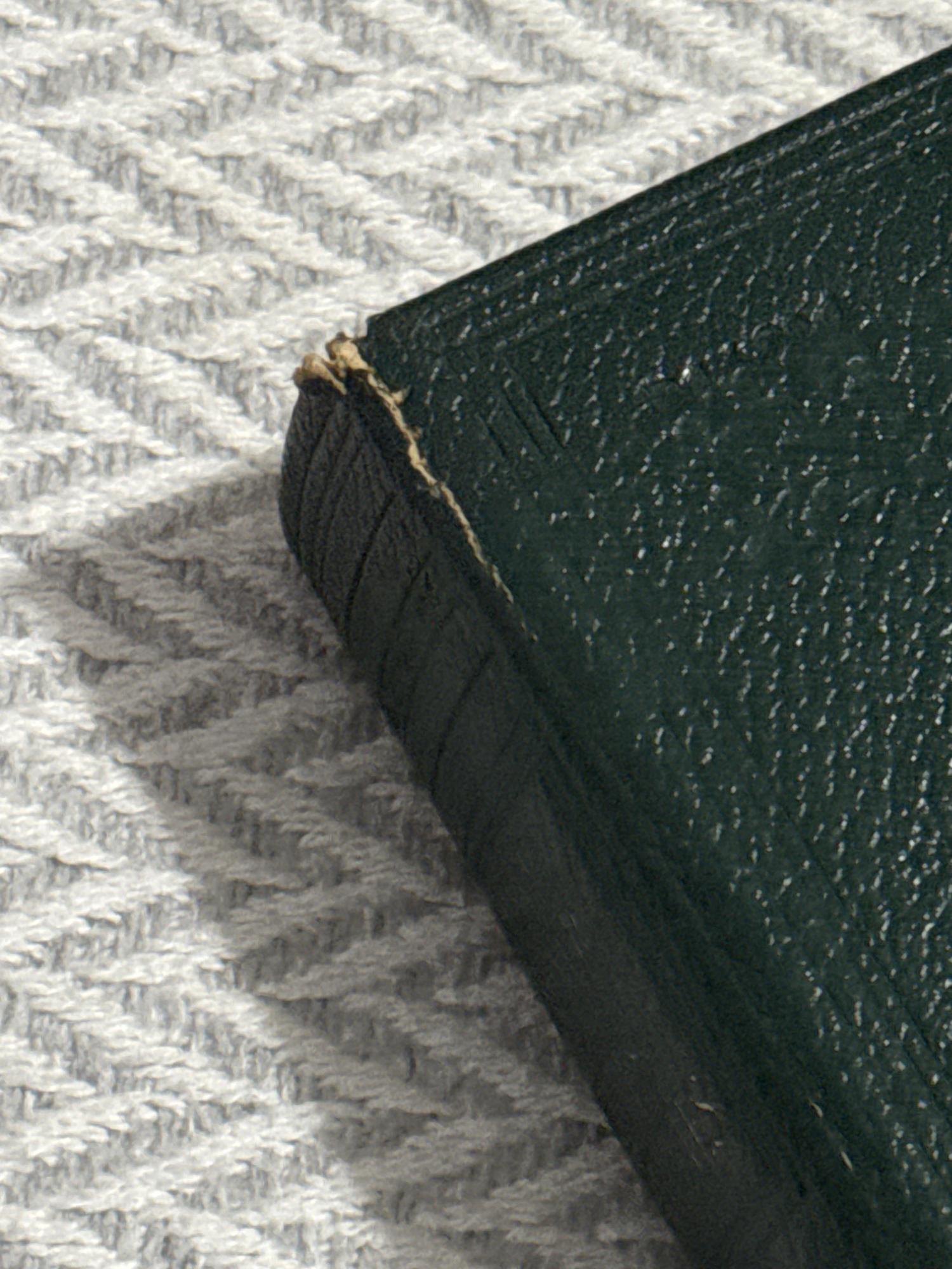 Tapa dura símil pell amb lletres i il·lustració daurats. Tall superior daurat
