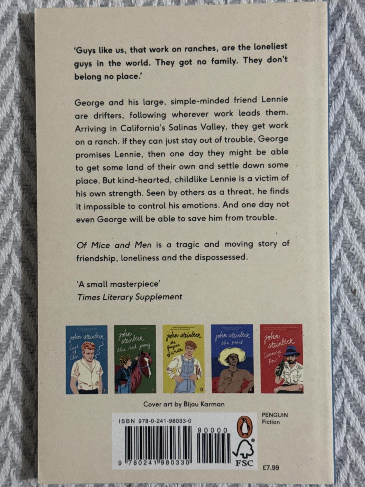 George y Lennie son dos trabajadores itinerantes que sueñan con tener un pedazo de tierra propia, pero su realidad está marcada por la precariedad y la soledad de la Gran Depresión. Lennie, con discapacidad intelectual, depende totalmente de George, y un incidente trágico pondrá a prueba la fragilidad de sus aspiraciones. La novela explora la amistad, la marginación y el choque devastador entre los sueños y la brutalidad social.