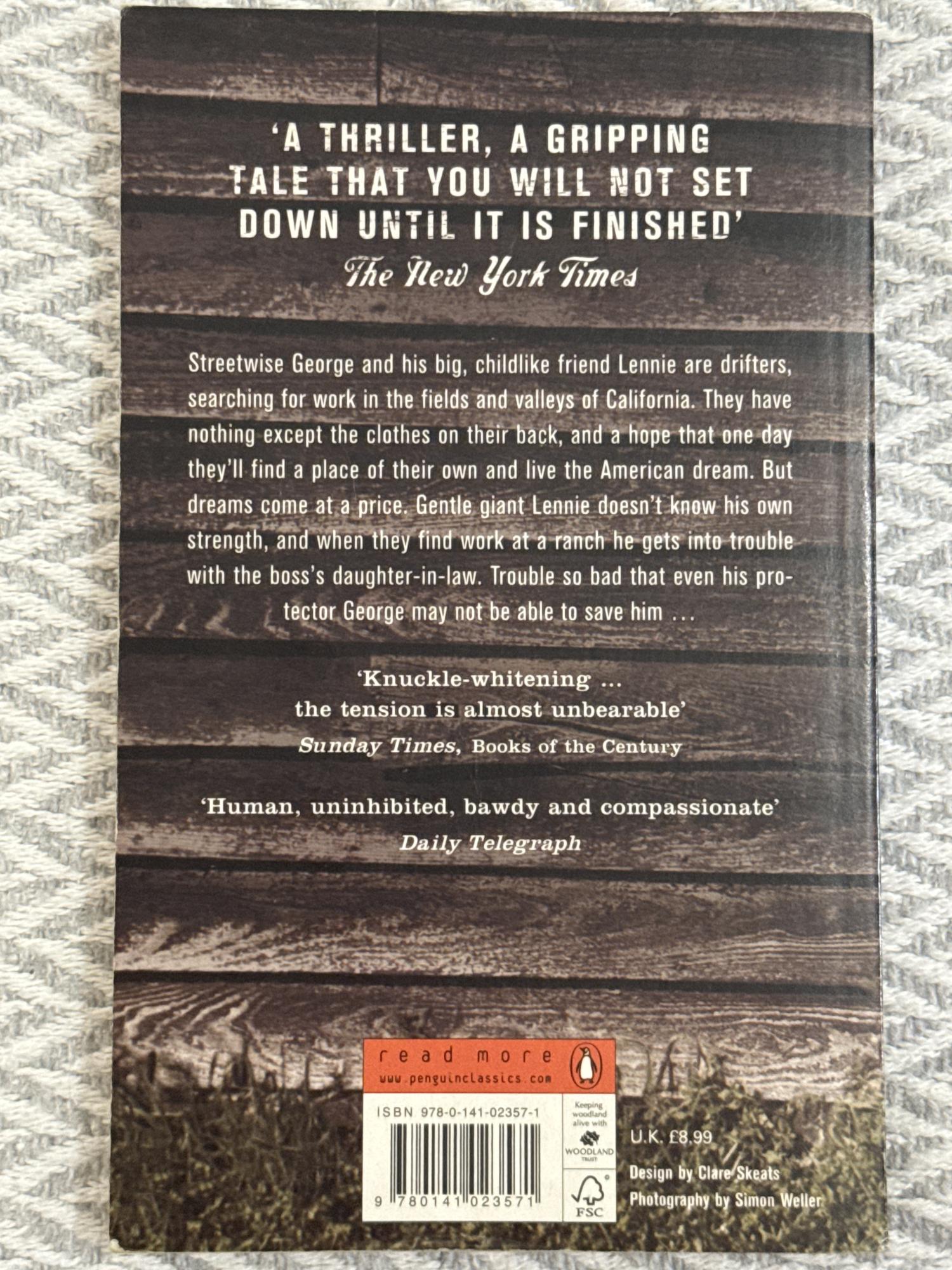 Dos jornaleros, George y Lennie, deambulan por los campos de California con el sueño de tener «un lugar propio», pero la dependencia de Lennie y la dureza de la realidad golpean sus aspiraciones, mostrando la vulnerabilidad de los marginados y la fragilidad del sueño americano.
