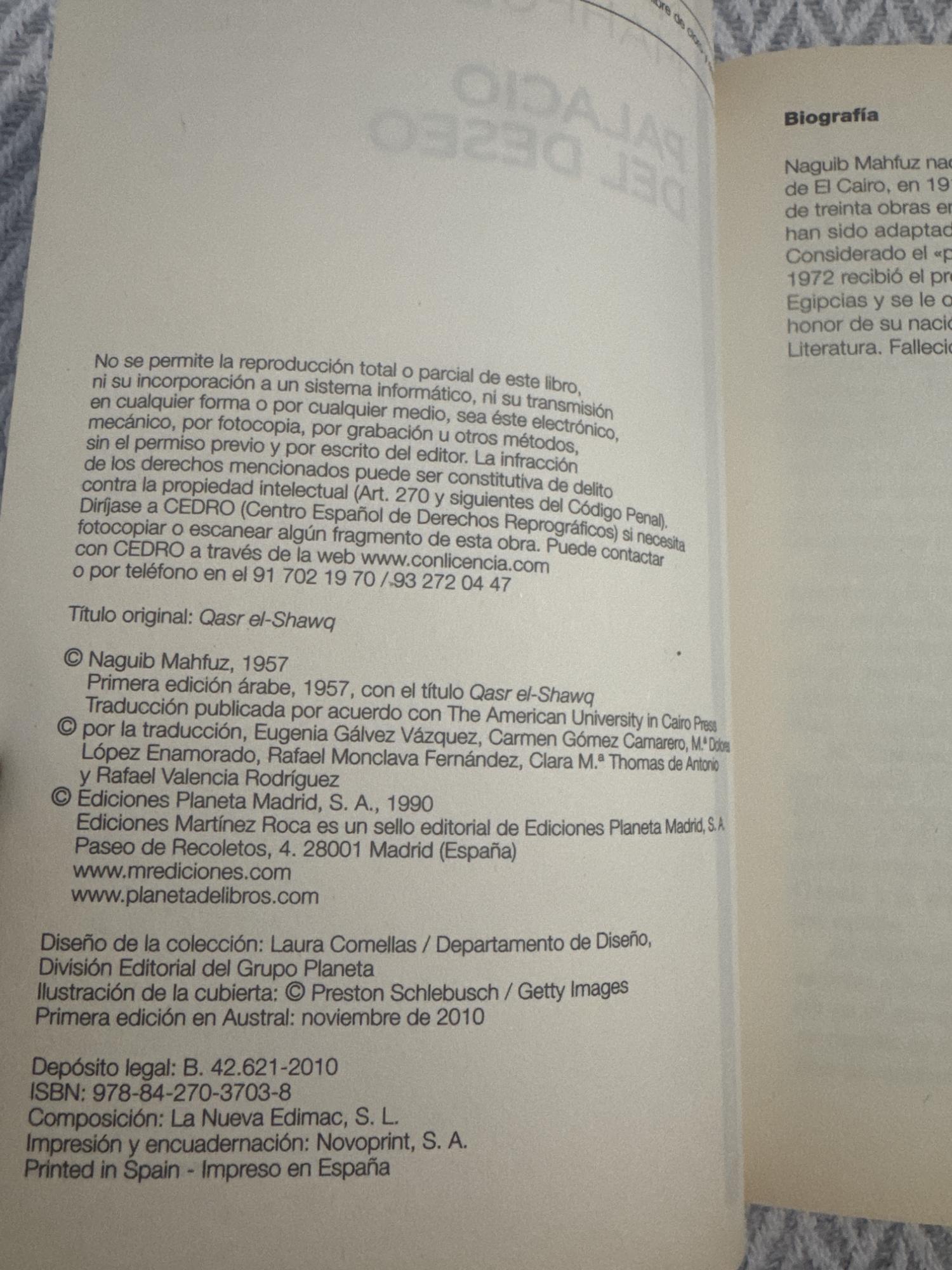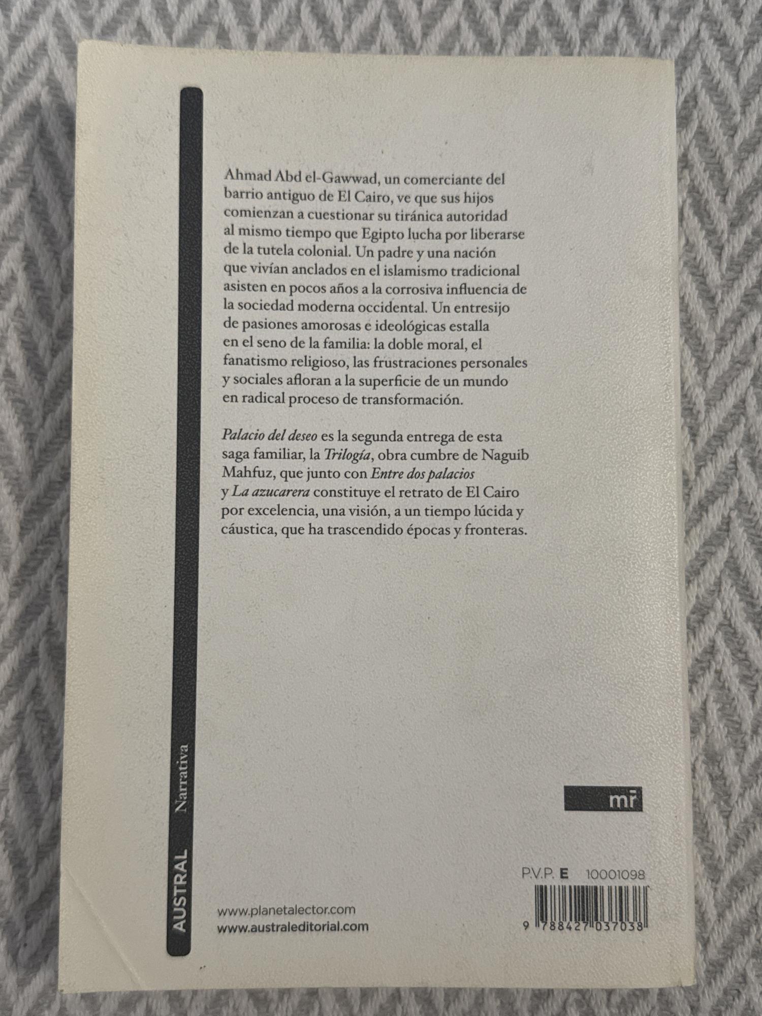 Palacio del deseo, de Naguib Mahfouz, es la segunda parte de la Trilogía de El Cairo y retrata la vida de una familia egipcia en un periodo de cambios sociales y políticos. La novela profundiza en los conflictos generacionales, los deseos individuales y las tensiones entre tradición y modernidad.