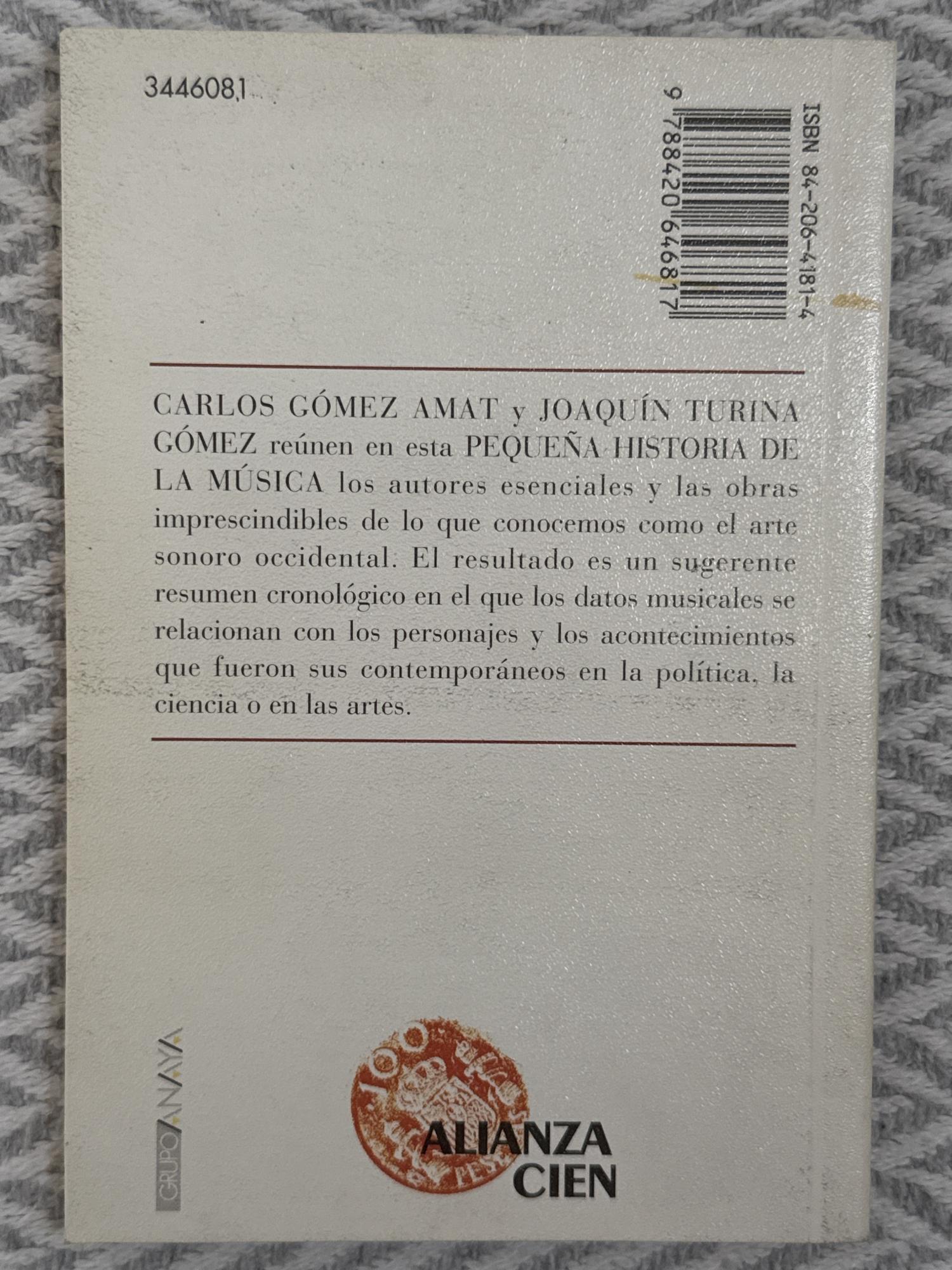 Pequeña historia de la música de Carlos Gómez Amat es una obra de divulgación que recorre de forma sintética y clara la historia de la música occidental desde la Antigüedad hasta la época contemporánea. El autor presenta los principales estilos, compositores y transformaciones musicales con un enfoque pedagógico y accesible.