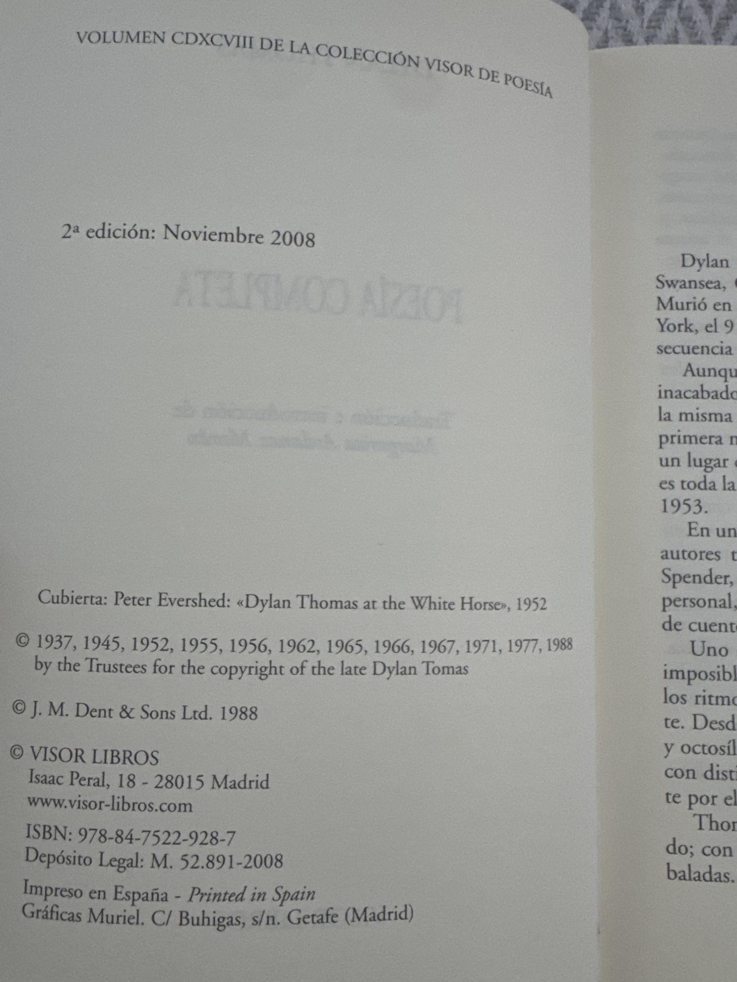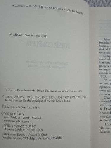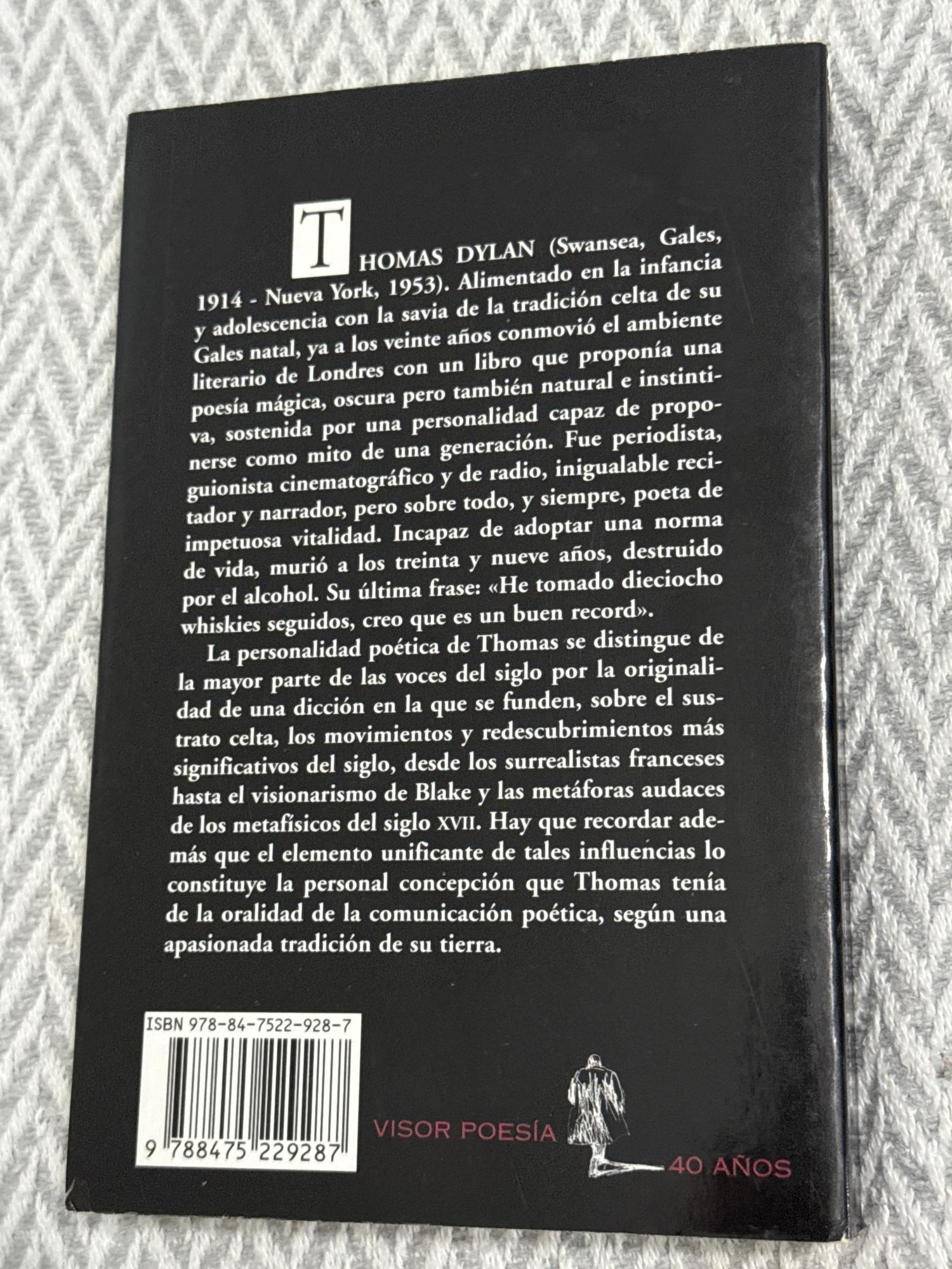 Reúne la totalidad de la obra poética de Dylan Thomas, caracterizada por un lenguaje musical, imágenes intensas y gran carga simbólica. Sus poemas exploran la vida, la muerte, el deseo y el paso del tiempo con un tono apasionado y visionario. Es una de las voces más influyentes de la poesía anglosajona del siglo XX.