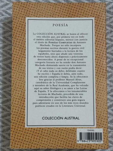 Poesías completas de Antonio Machado es una antología que reúne toda su obra poética, con varias ediciones revisadas por él mismo hasta 1936. Incluye sus poemarios más conocidos: Soledades. Galerías. Otros poemas, Campos de Castilla, además de poemas sueltos, composiciones inspiradas por su vida y por paisajes, recuerdos, tiempo, muerte, amor y patria.