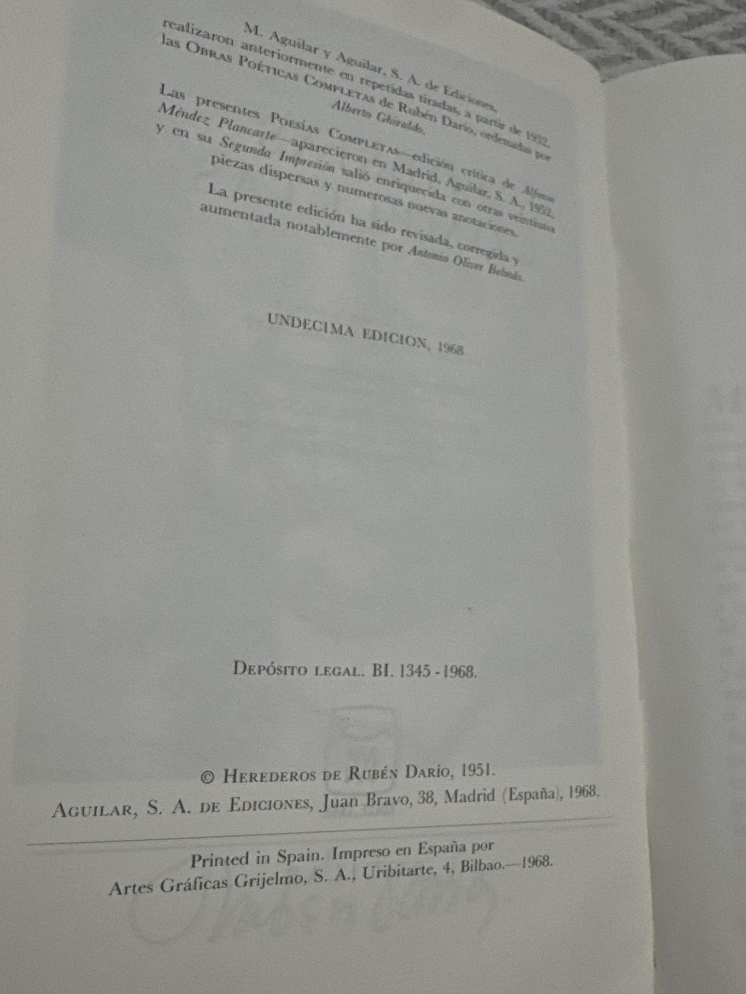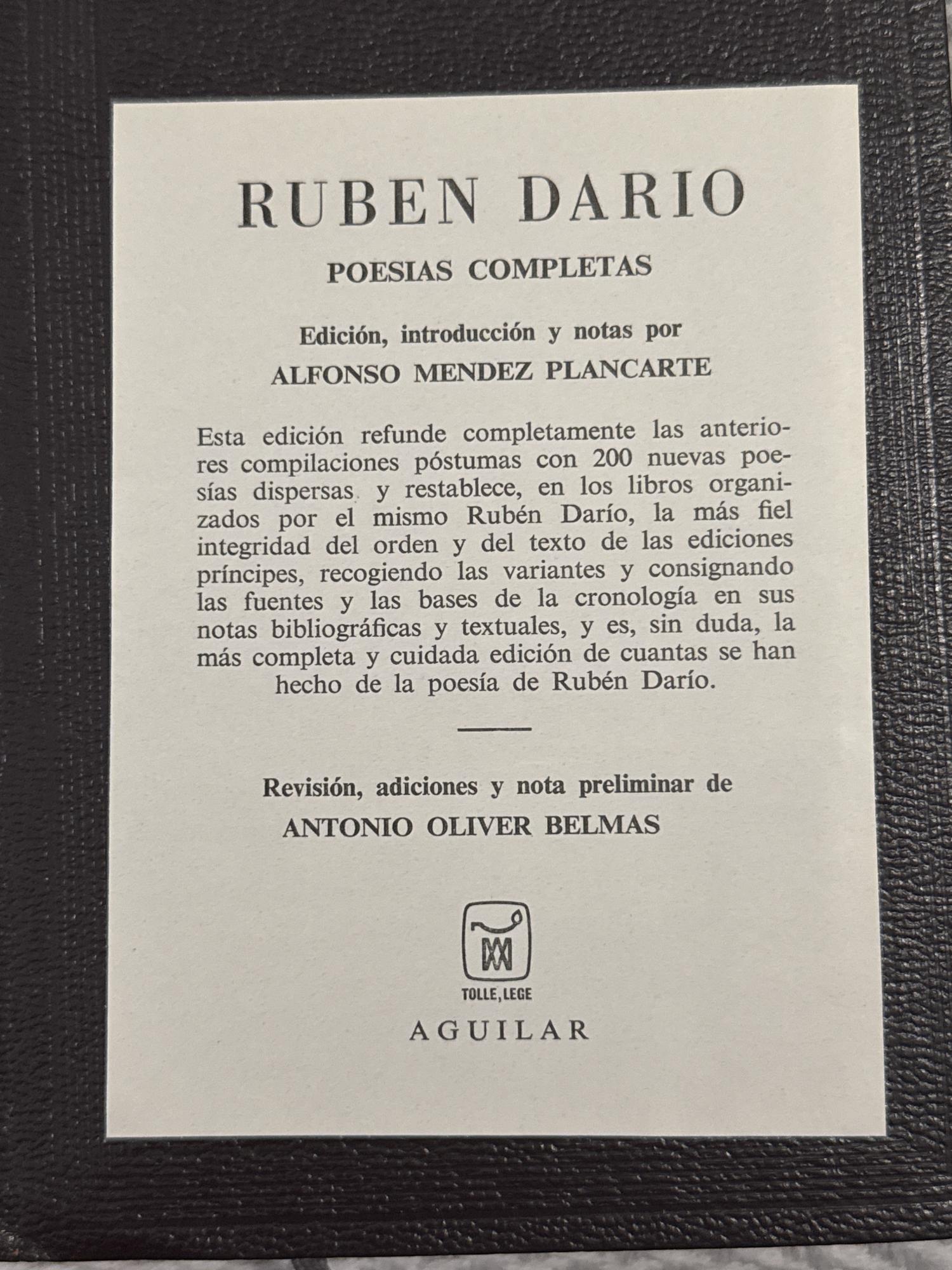 Poesías completas de Rubén Darío reúne el conjunto de la producción poética del autor, figura central del modernismo hispánico. El volumen permite recorrer la evolución de su obra, caracterizada por la renovación formal del lenguaje poético, la musicalidad del verso y la influencia de corrientes simbolistas y parnasianas.