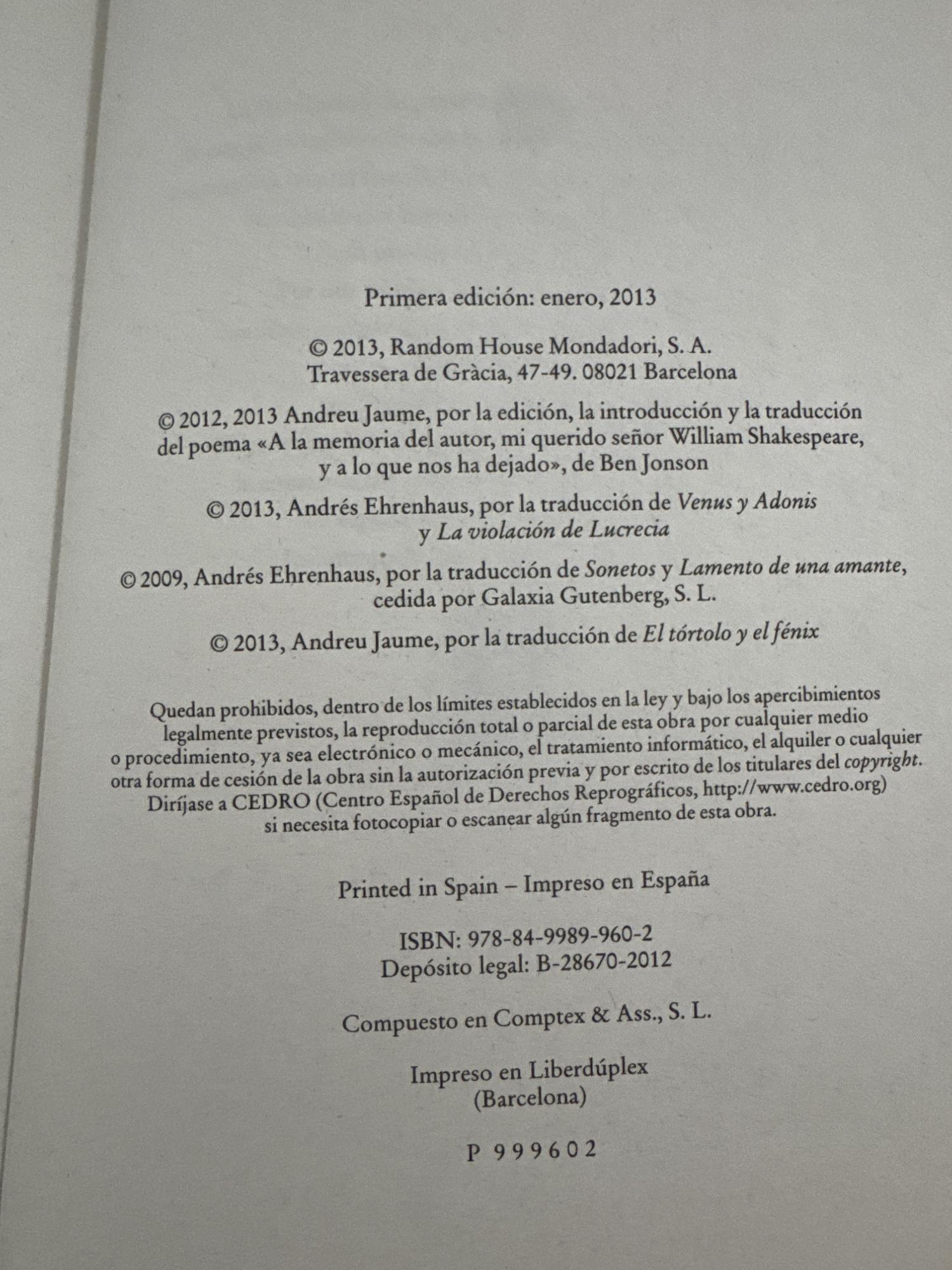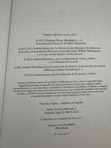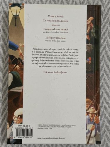 Reúne la obra poética de Shakespeare, incluidos los sonetos y los poemas narrativos. Sus versos exploran el amor, el paso del tiempo, la belleza, la muerte y la creación artística con gran riqueza formal y retórica. Es una pieza fundamental de la poesía inglesa y de la literatura universal.