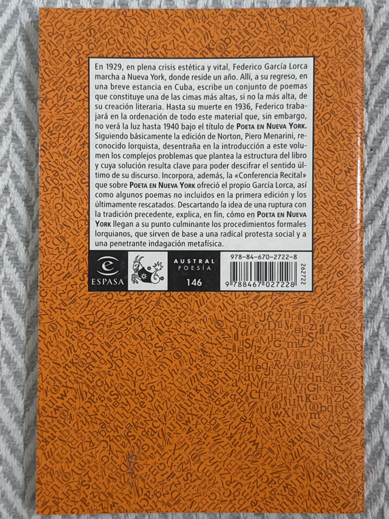 Poeta en Nueva York es un poemario que Lorca comenzó a escribir durante su estancia en Nueva York en 1929, y posteriormente continuó tras una breve estancia en Cuba.