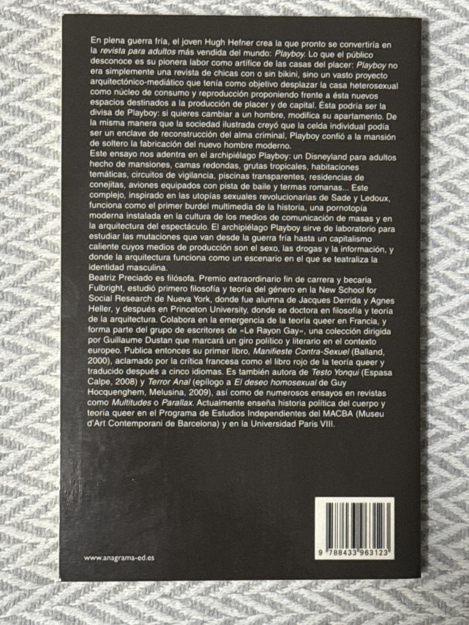 Es un ensayo de pensamiento crítico sobre la cultura occidental del sexo, el capitalismo mediático y la construcción de identidades a través de la revista Playboy y su arquitectura simbólica de placer y consumo. La obra combina historia cultural, teoría queer y análisis socio-político para repensar cómo el deseo y los espacios de placer se interrelacionan con el poder y las prácticas sexuales contemporáneas.