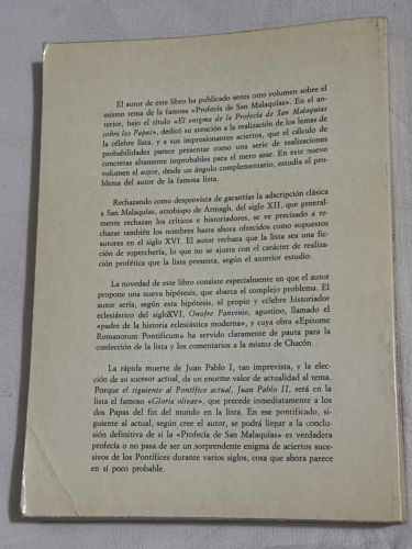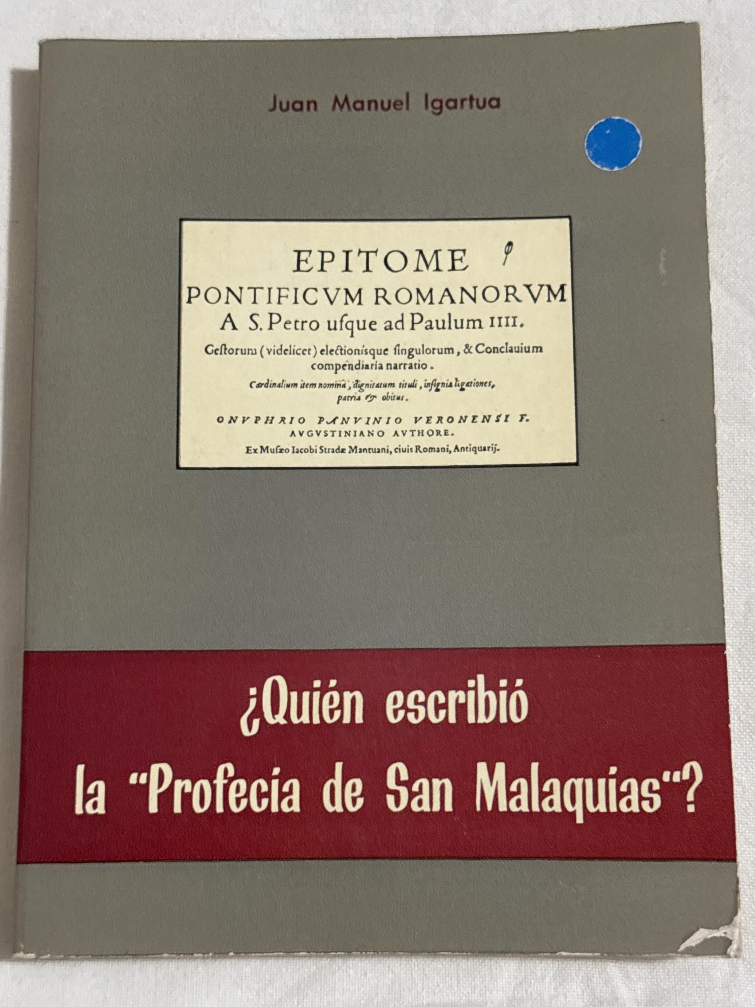 En este trabajo, el autor Juan Manuel Igartua, jesuita e historiador, investiga el origen real de la Profecía de San Malaquías. A través de documentos y estudios históricos, plantea que el texto no pudo haber sido escrito por el propio San Malaquías (siglo XII), sino probablemente por Onofre Panvinio, un erudito del siglo XVI, y más tarde atribuido a San Malaquías por Alfonso Chacón