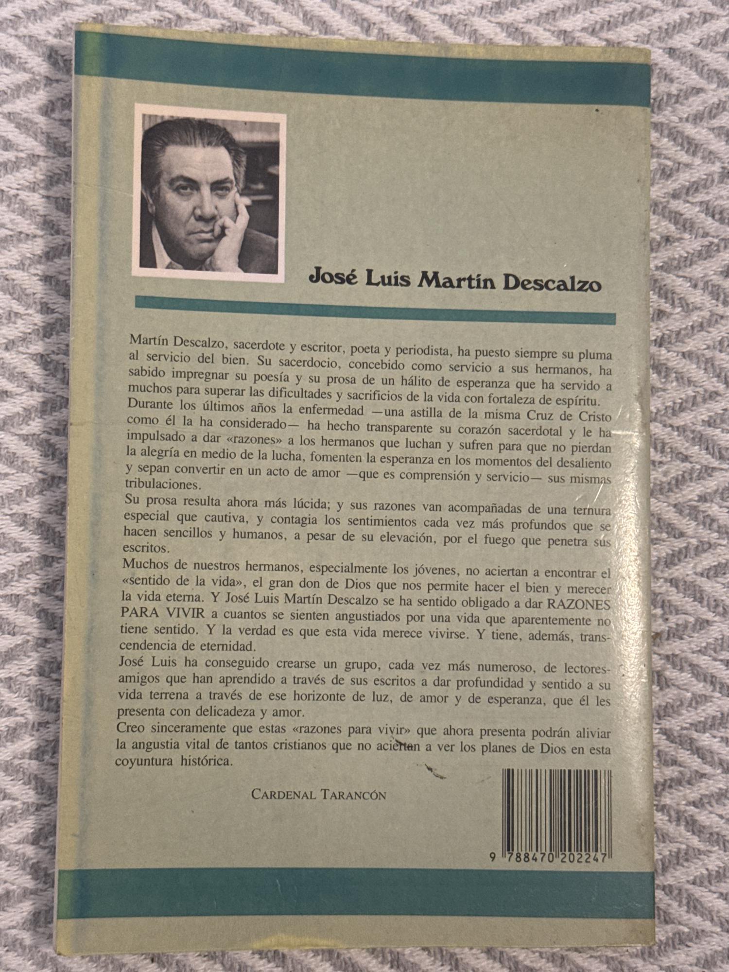Razones para vivir, de José Luis Martín Descalzo, es un libro de reflexiones sobre el sentido de la vida, la esperanza y los valores humanos desde una perspectiva cristiana. A través de textos breves y meditativos, el autor invita al lector a encontrar motivos para vivir con optimismo, fe y compromiso con los demás.