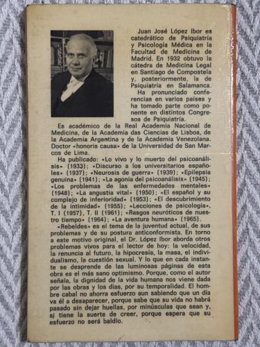Rebeldes es un ensayo en el que López Ibor analiza la conducta rebelde, especialmente en jóvenes, desde una perspectiva psicológica y social. El autor estudia las causas emocionales y culturales de la rebeldía y reflexiona sobre su papel como síntoma de crisis personales y de transformación social.
