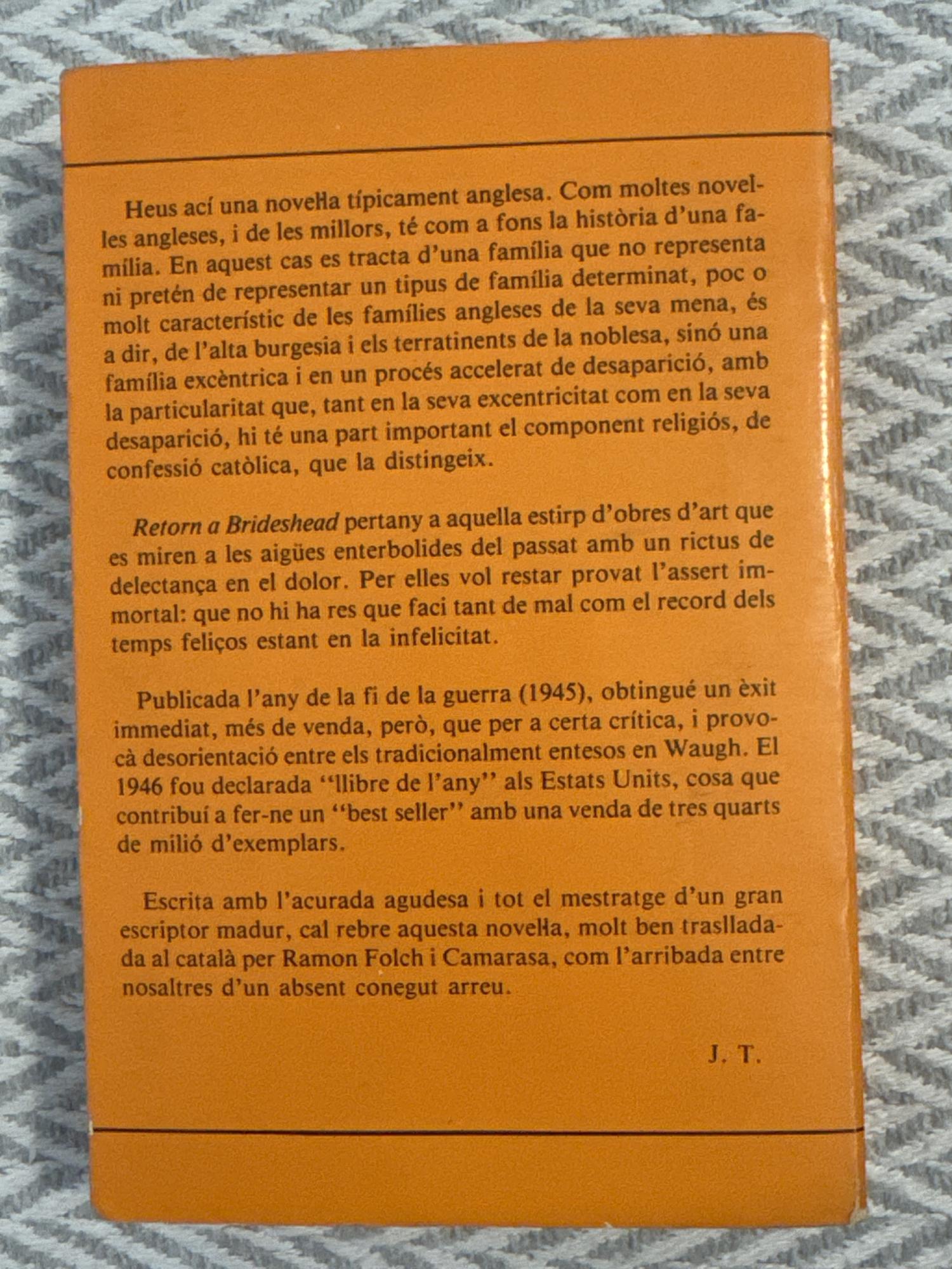 Retorn a Brideshead, de Evelyn Waugh, narra la relació entre el protagonista i una família aristocràtica anglesa al llarg dels anys. A través del record i la nostàlgia, la novel·la explora temes com la decadència social, la religió, l’amistat i el pas del temps.